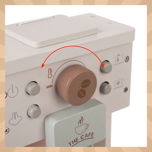 Alt, hvad en lille barista behøver, er inkluderet – kapsler, kopper og en mælkekarton. Børnene lærer køkkenredskaber at kende på en sikker måde, træner præcision og kan deltage i fælles leg med venner eller søskende.