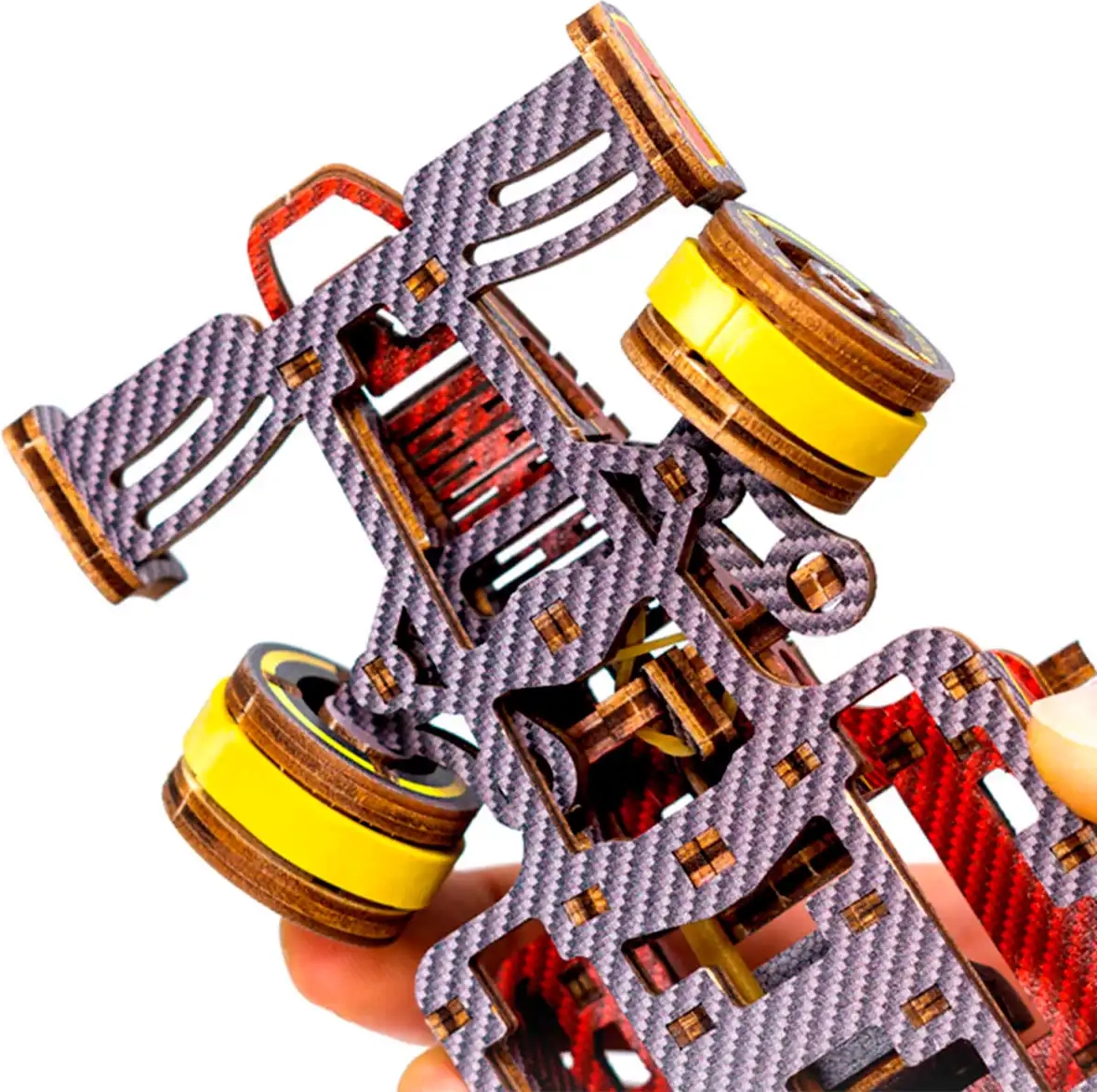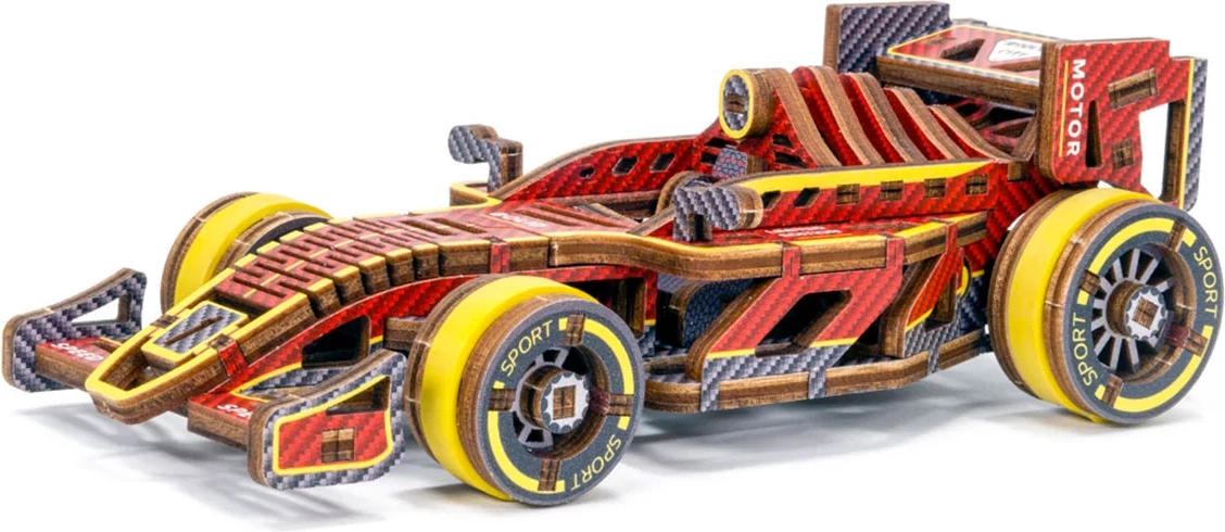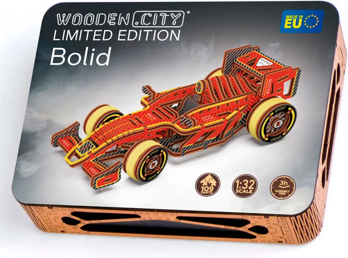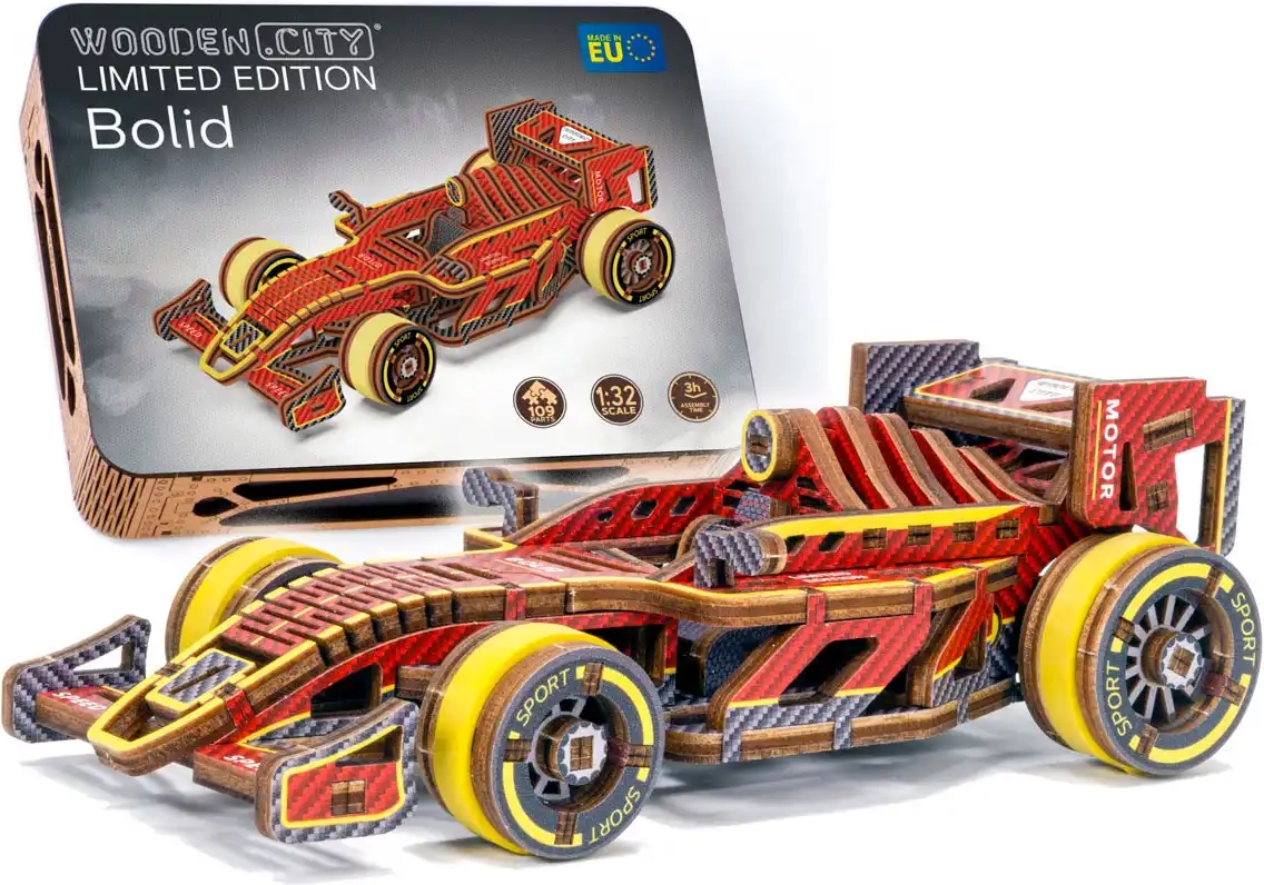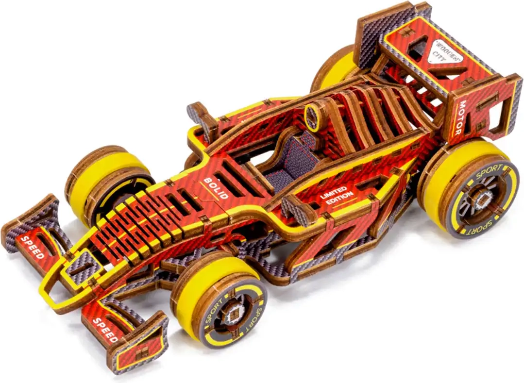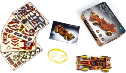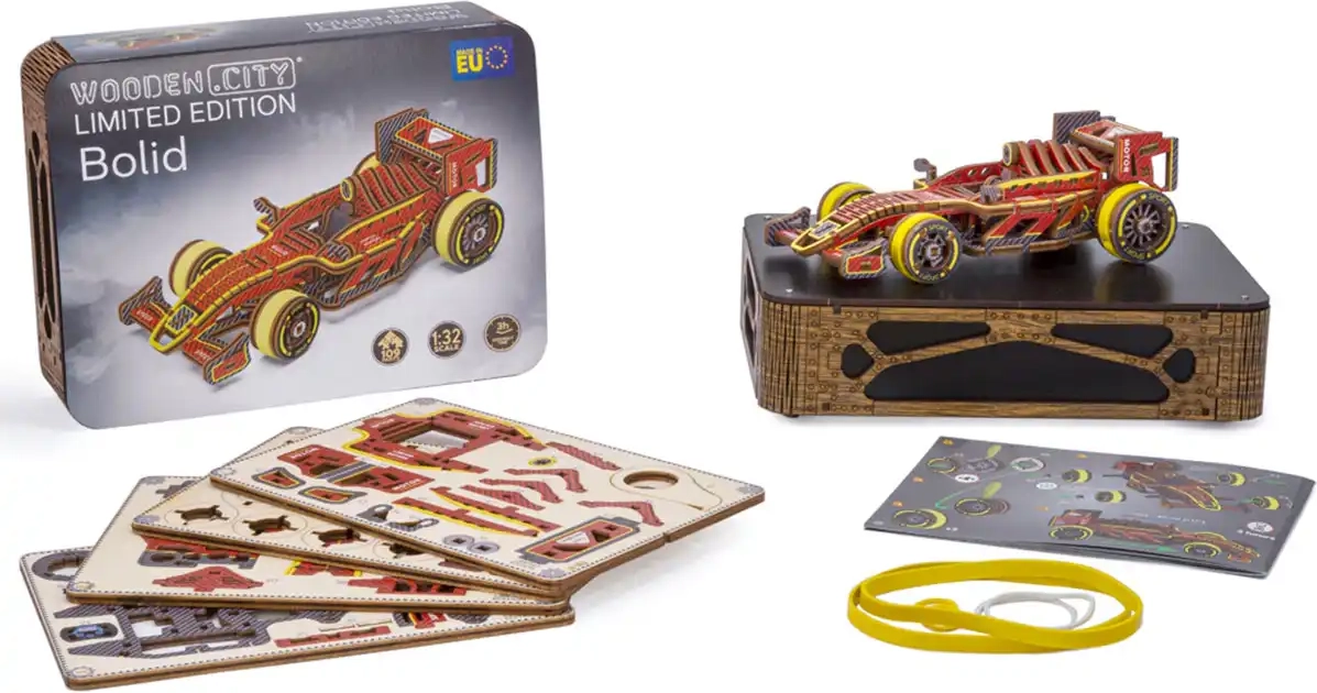 Oplev verdenen af mekaniske træmodeller med den limiterede racerbilsbolid WOODEN CITY. Takket være præcis laserskæring i kvalitets birkekrydsfiner passer hver del perfekt, og resultatet er en funktionsdygtig model med jævn gang. Gummidrevet kan efter optrevling tilbagelægge op til 1 meter, mens den styrbare foraksel giver en realistisk kørsel.