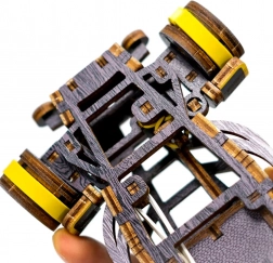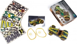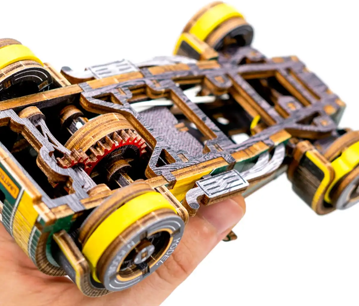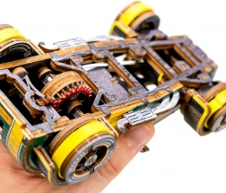 Modellen er udstyret med en gummimotor, som efter optræk kan køre cirka 1 m. Forakslen er styrbar, så du kan styre din roadster, som du vil. Den elegante trækasse med magnetiske clips fungerer ikke kun som gaveæske, men også som en praktisk stander til udstilling.