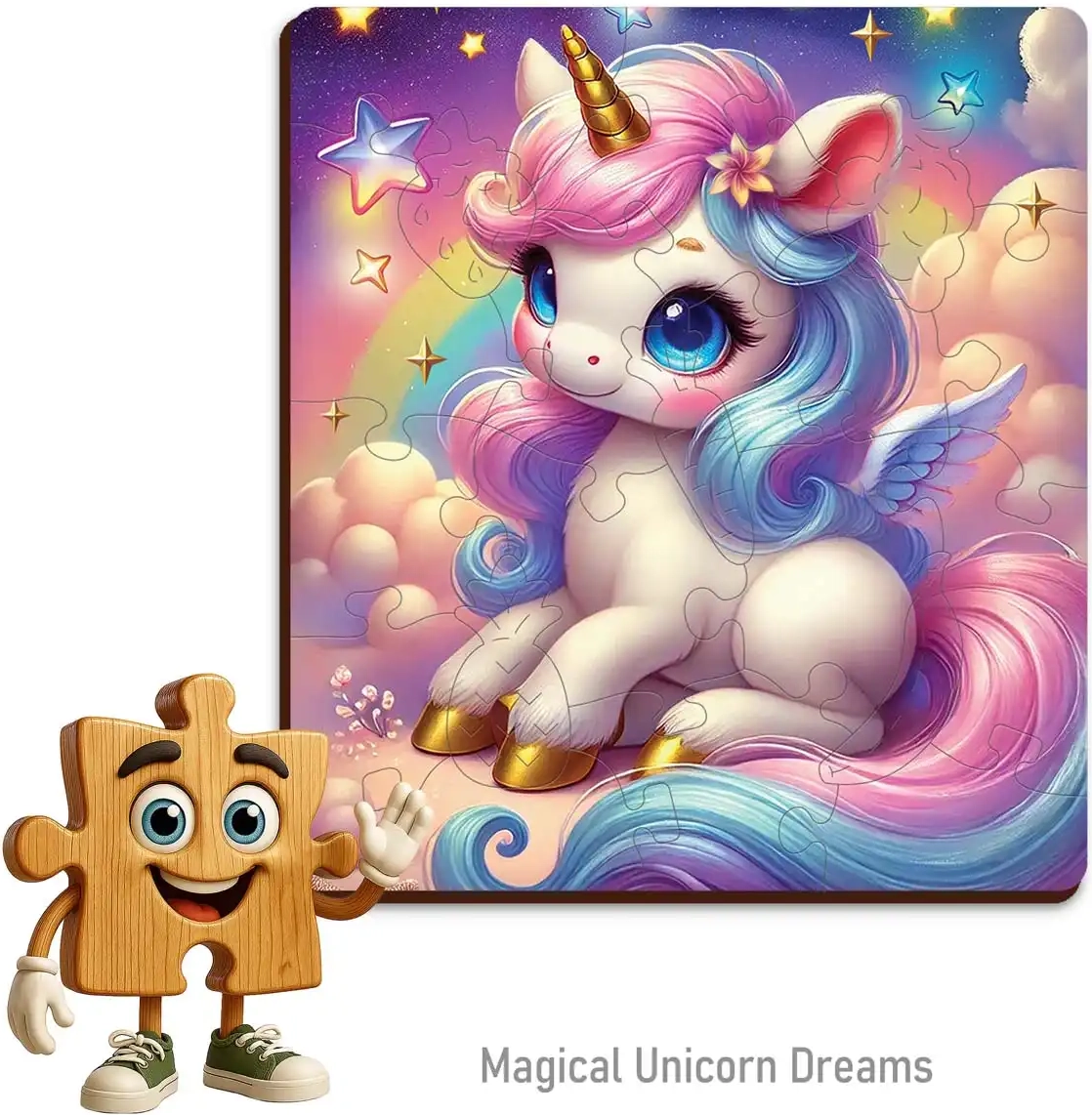Dette sæt er en fantastisk gave til børn, der elsker enhjørninger og vil øve sig i at lægge puslespil med et kvalitets træpuslespil fra WOODEN CITY.