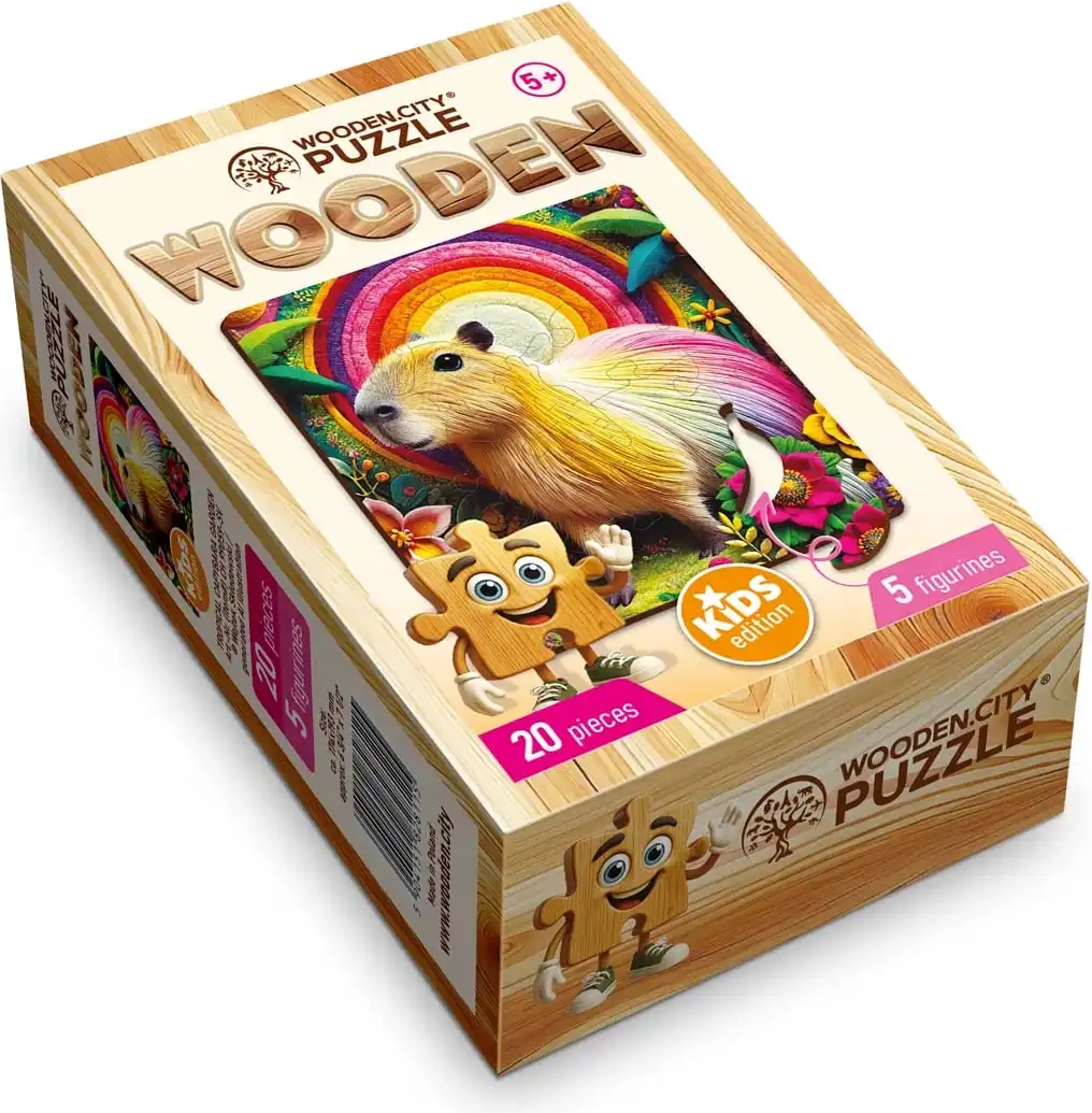 Opdag et sjovt og kvalitetsrigt træpuslespil med motiv af en kapybara, ideelt til børn og begyndere. Det byder på 20 solide brikker, hvoraf 5 er unikt formede, og takket være præcis laserskæring har brikkerne glatte kanter uden splinter. Puslespillet understøtter koncentration, tålmodighed og kreativitet, og der medfølger også en separat forlæg for lettere samling.