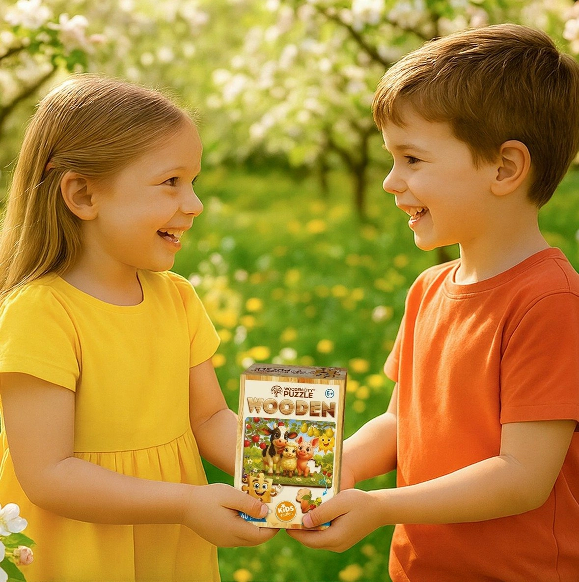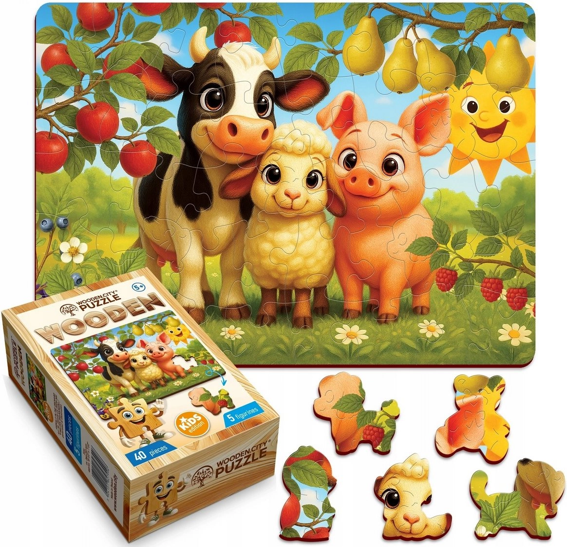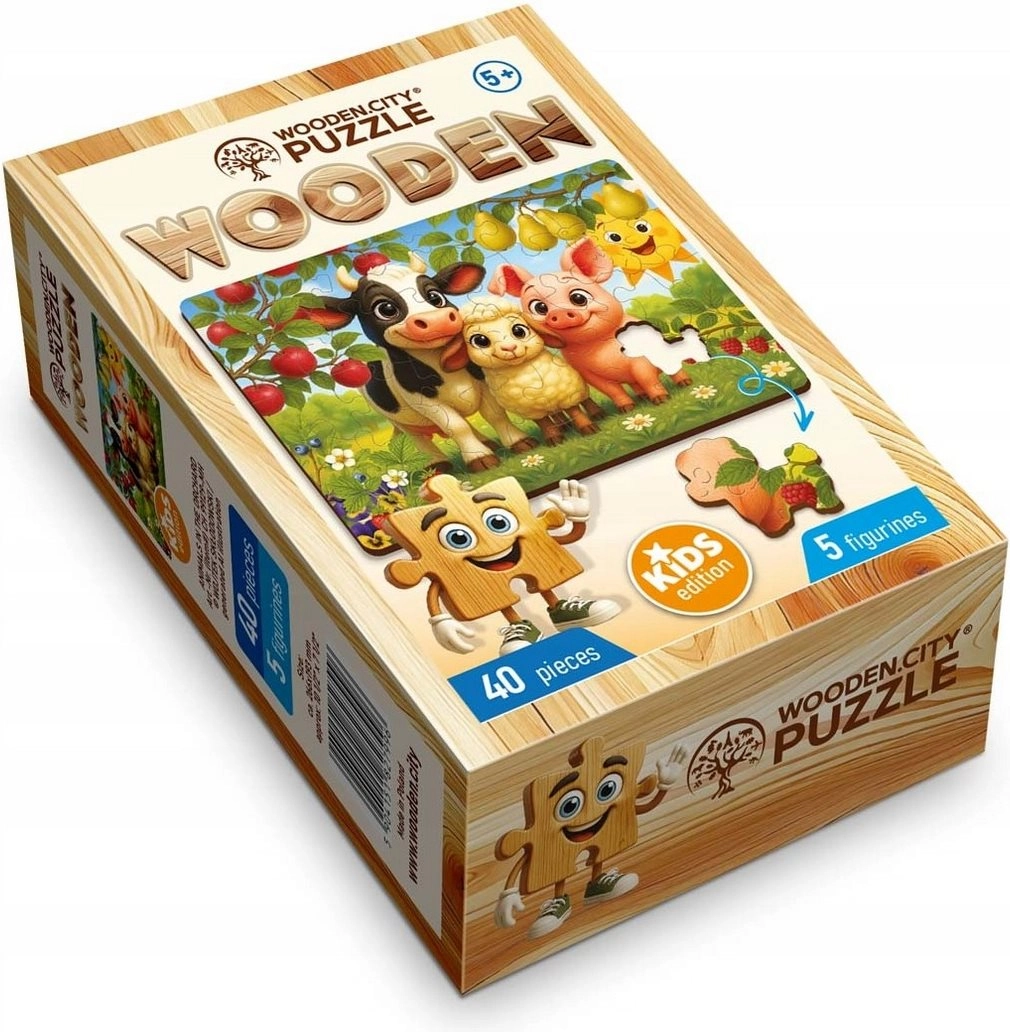 WOODEN CITYs træpuslespil forener leg og læring. Takket være præcis laserskæring har brikkerne perfekt glatte kanter uden splinter, passer præcist sammen og skaber en farverig scene med dyr fra gården. Et separat forlæg medfølger for nem lægning.