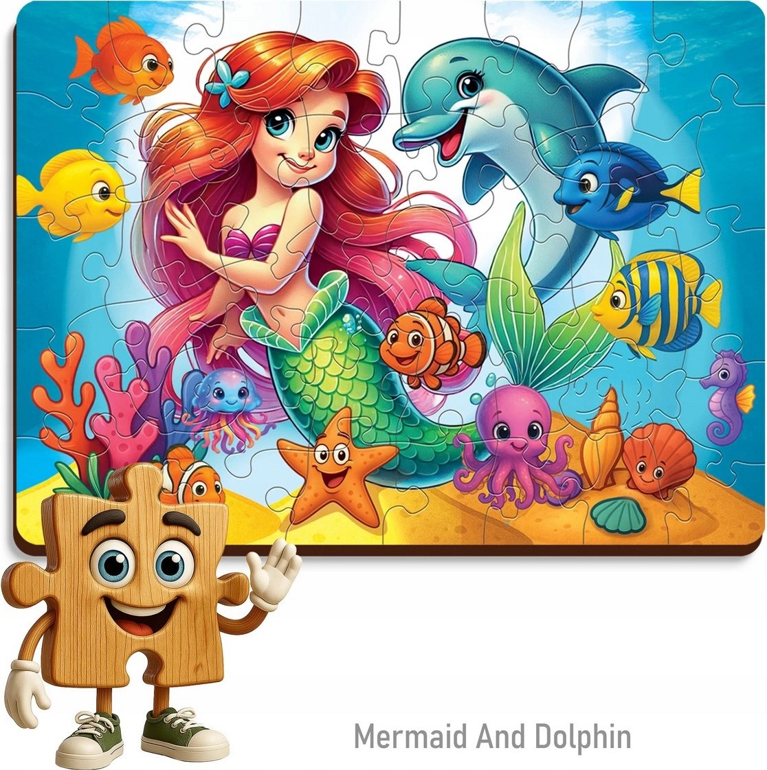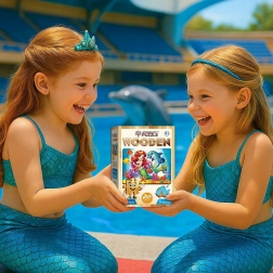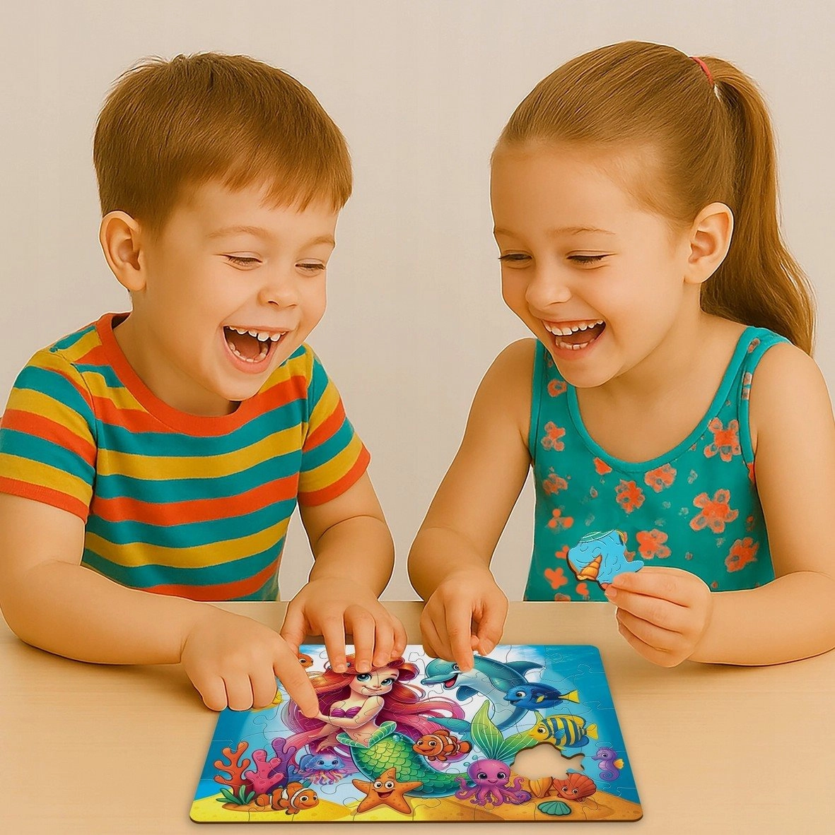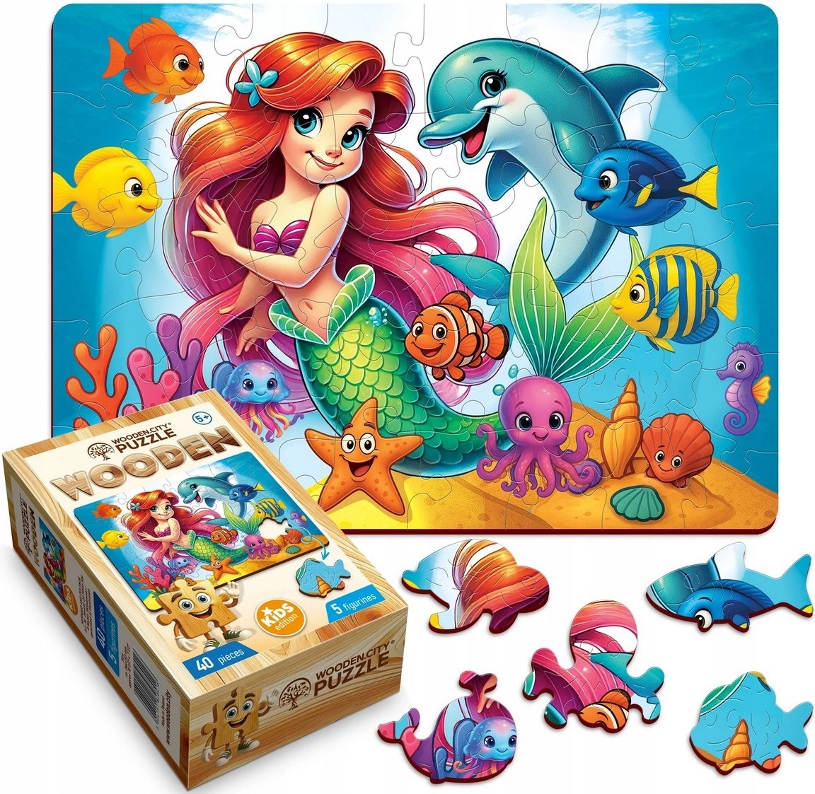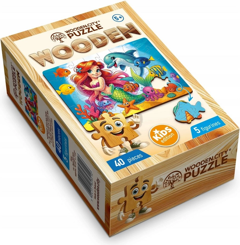 WOODED CITY træpuslespil med motiv af havfrue og delfin giver børn en smuk visuel oplevelse og glæden ved et færdigt billede. Takket være den høje kvalitet lægges brikkerne behageligt og passer perfekt sammen. Det færdiglagte billede måler cirka 26,6 × 19,3 cm, ideelt til gentagen lægning eller til udstilling.