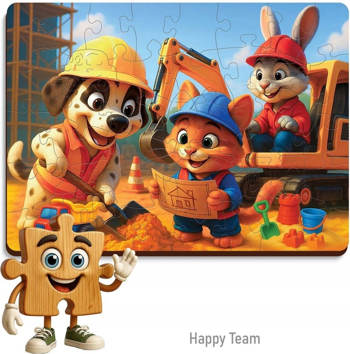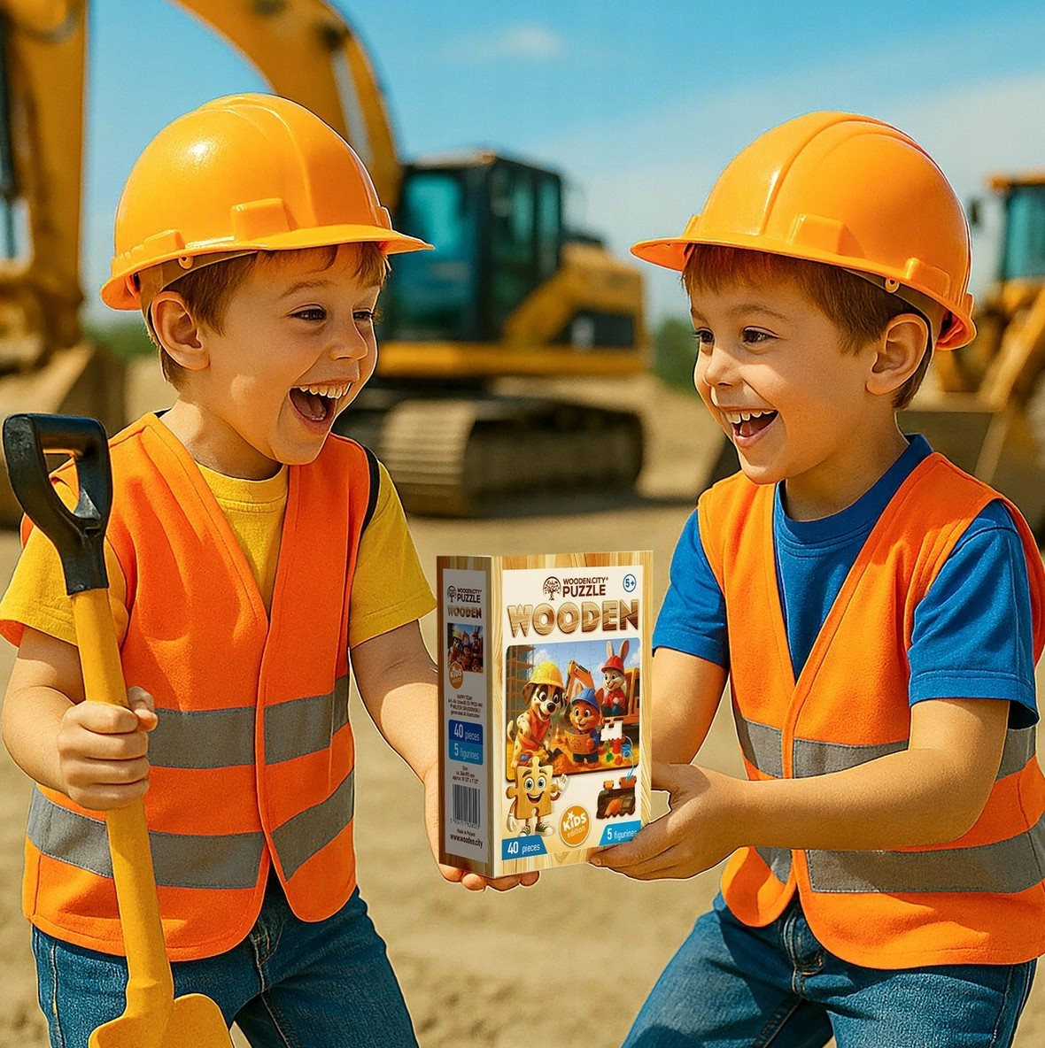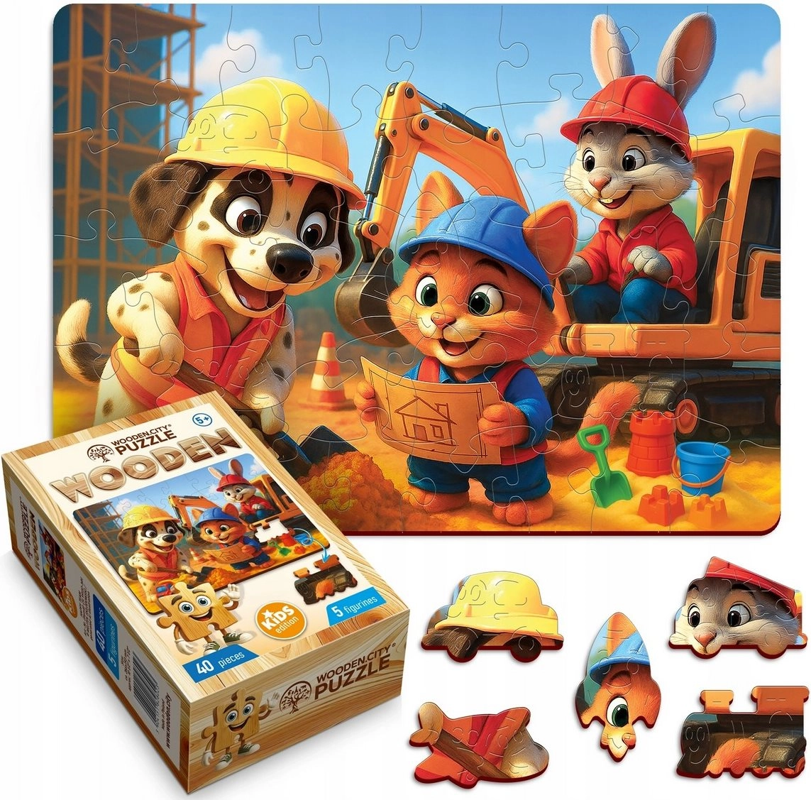 Træpuslespillet WOODEN CITY Sjovt team giver børn en underholdende pusleoplevelse med høj kvalitet og behageligt træmateriale. Med 40 solide brikker og 5 specielle former træner børn finmotorik og logisk tænkning, mens de nyder en farverig scene med søde dyrebyggere.