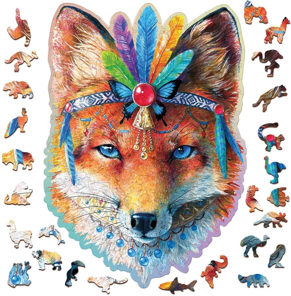 Træpuslespillet WOODEN CITY Mystisk ræv er en smuk udfordring for både børn og voksne. Takket være de robuste træbrikker og de originale former er puslespillet både sjovt, kreativt og afslappende at lægge. Rævemotivet fungerer som en stilfuld dekoration, når det er samlet.