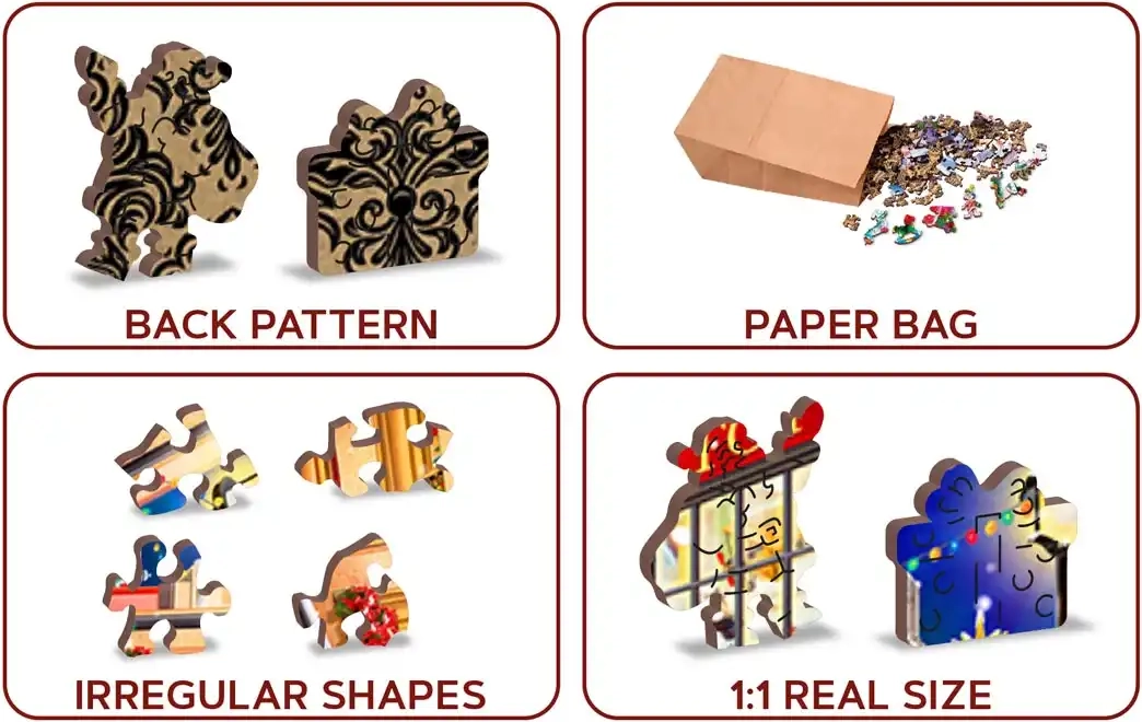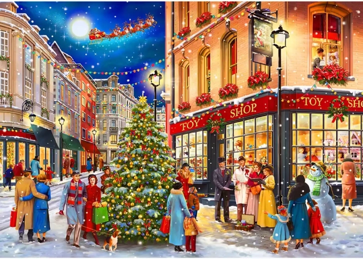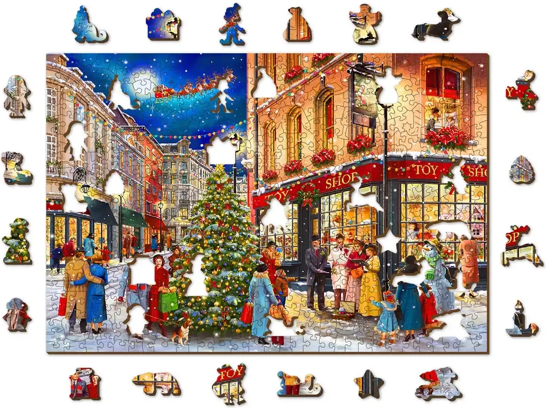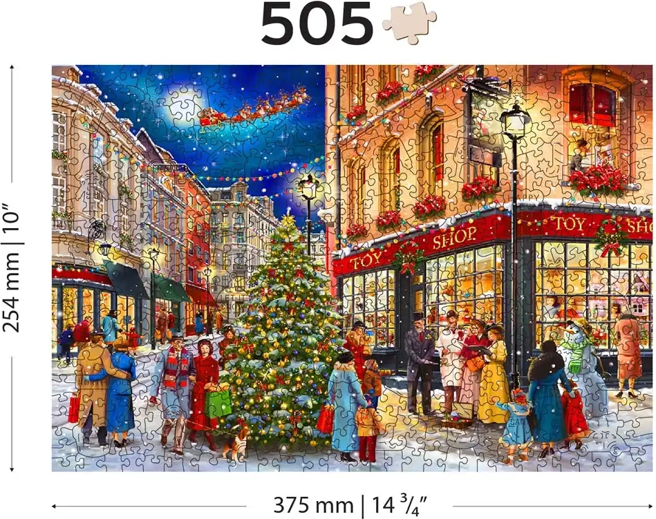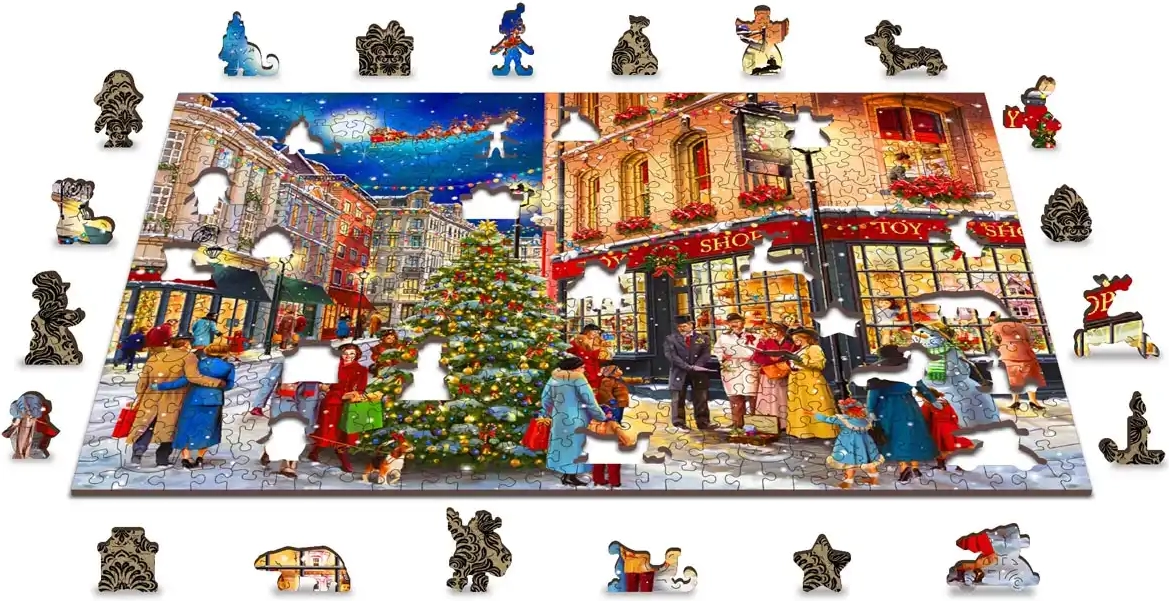 Oplev julens magi med et premium træpuslespil, der begejstrer både puslespilsentusiaster og som en stilfuld gave. Motivets julegade med juletræ, julesangere og hyggelige butiksvinduer skaber en behagelig, festlig stemning og er en skøn aktivitet til kolde aftener.