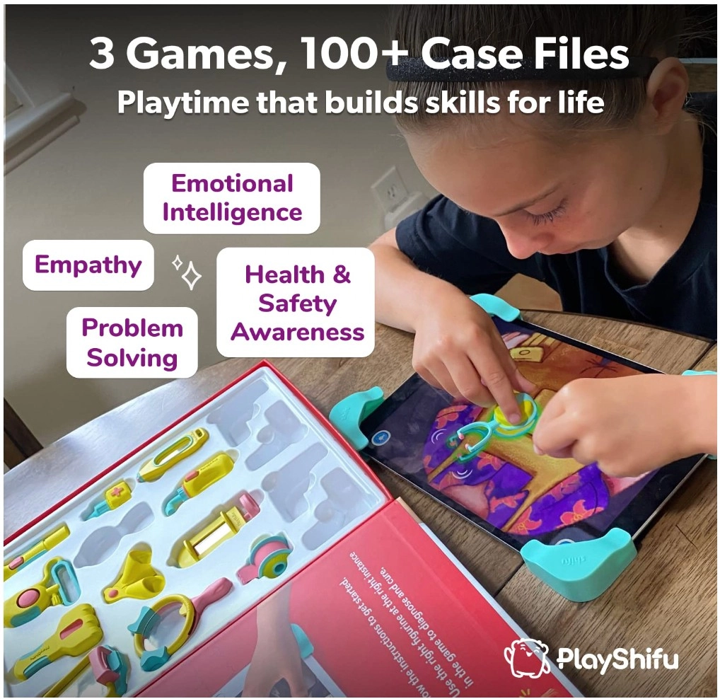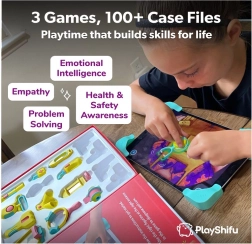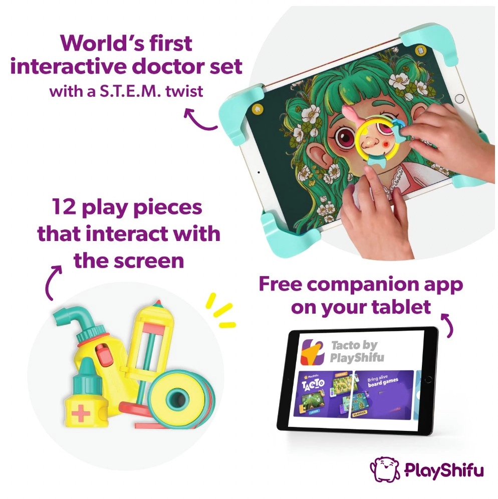 Forvandl din tablet til en børneklinik med det interaktive spil DOKTOR! Dette smarte sæt til børn fra 4–8 år kombinerer rigtige lægeredskaber med en app og understøtter finmotorik, kreativitet og logisk tænkning. Sættet indeholder 12 realistiske redskaber, en praktisk kuffert og hjørner til fastgørelse af tablet – tablet medfølger ikke.