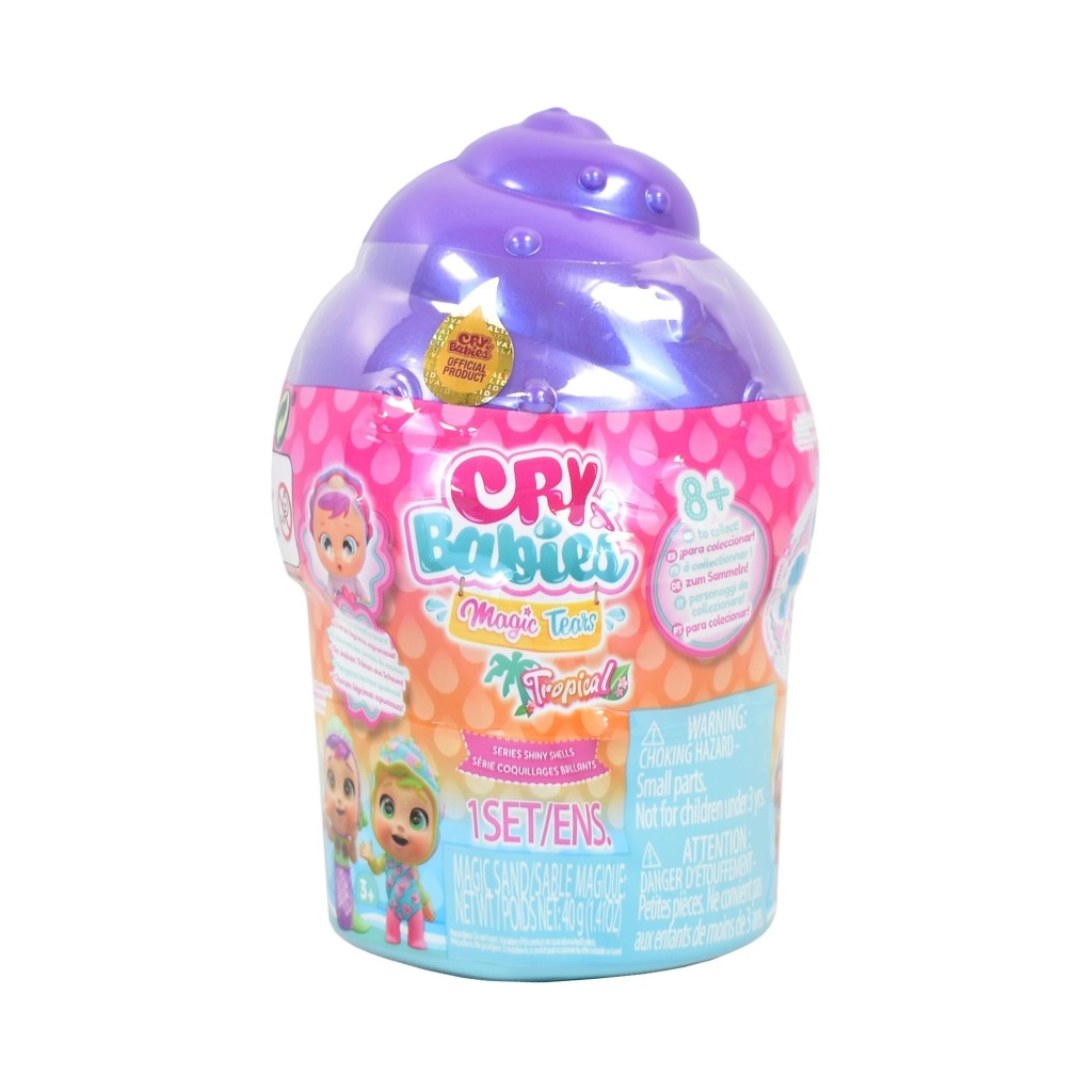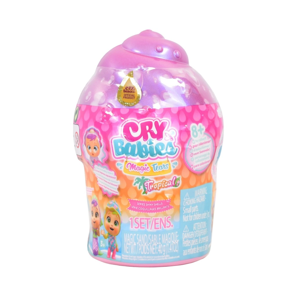 Dukken Cry Babies Magic Tears Shiny Shell giver børn glæden ved unboxing og en fantasifuld verden fuld af tilbehør. Hver dukke er gemt i en perlemorsskinnende muslingekapsel, som ved åbning afslører mere end 9 overraskelser skjult i sandet. Når flasken fyldes med vand, og maven trykkes let, fælder dukken skummende tårer – en effektfuld detalje, der styrker den følelsesfulde rolleleg og omsorg.