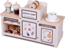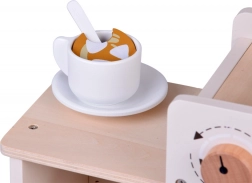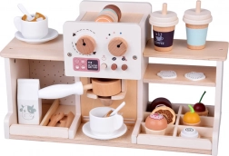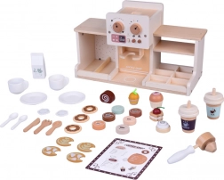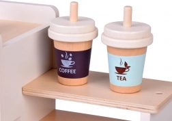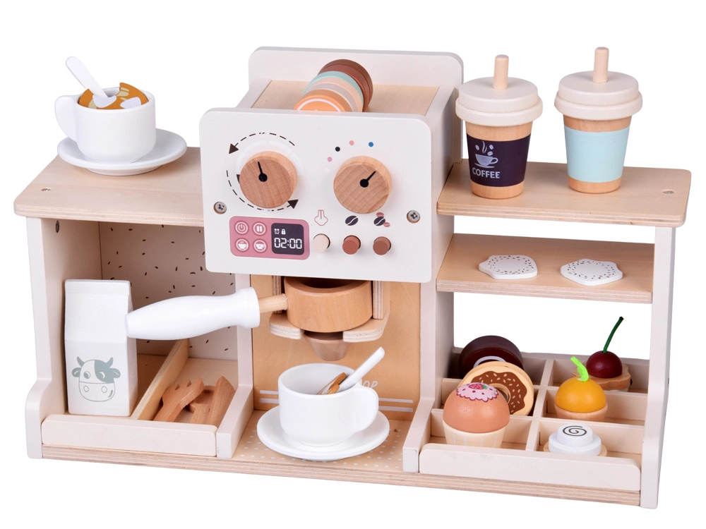 Oplev baristaverdenens magi med en træcafé, der både ligner og fungerer som den ægte vare. Børn kan “indstille” kaffestyrken med drejeknapper, sætte portafilter i, vælge kapsler med kaffe eller te, skumme “mælk” og servere desserter på tallerkener. Den robuste trækonstruktion med sikre farver og en blid pastelpalette sikrer lang holdbarhed og et smukt udseende i børneværelset.
