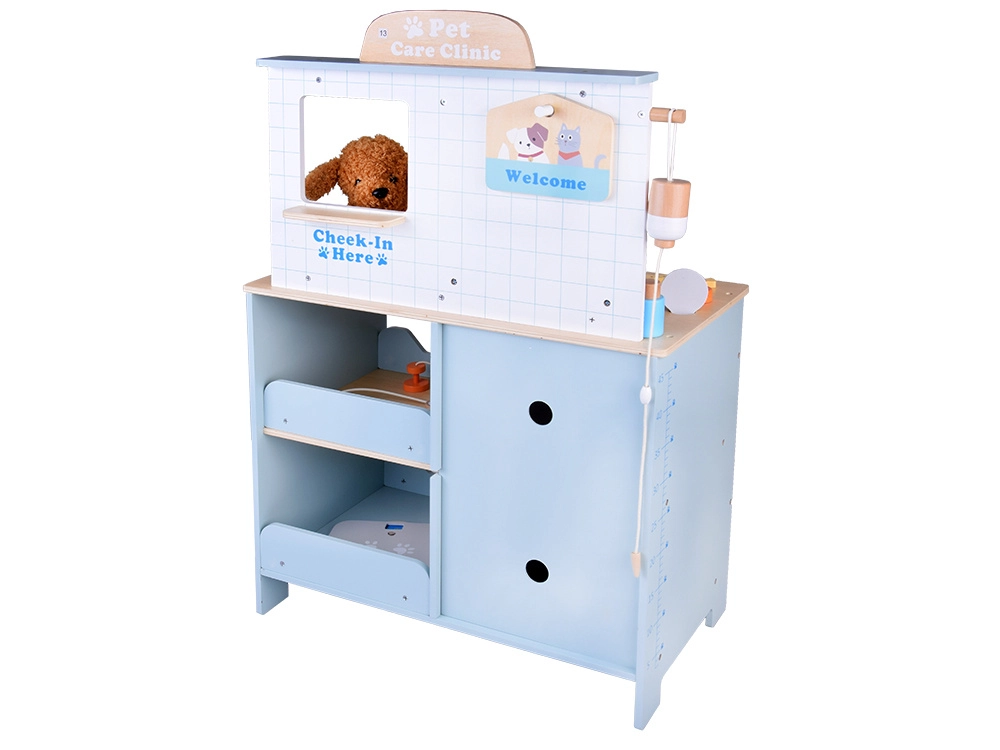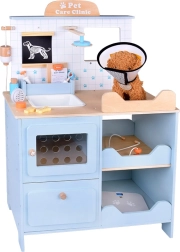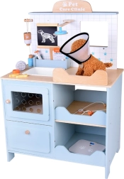 Den træbaserede dyrlægeklinik til børn rummer alt, små dyreelskere behøver for at passe deres plyspatienter. Den robuste trækonstruktion med afrundede kanter og giftfri farver sikrer sikker leg, mens gennemtænkte elementer – vask, hylder, indskrivningsvindue, tavle og opbevaringsrum – gør legen autentisk og overskuelig.