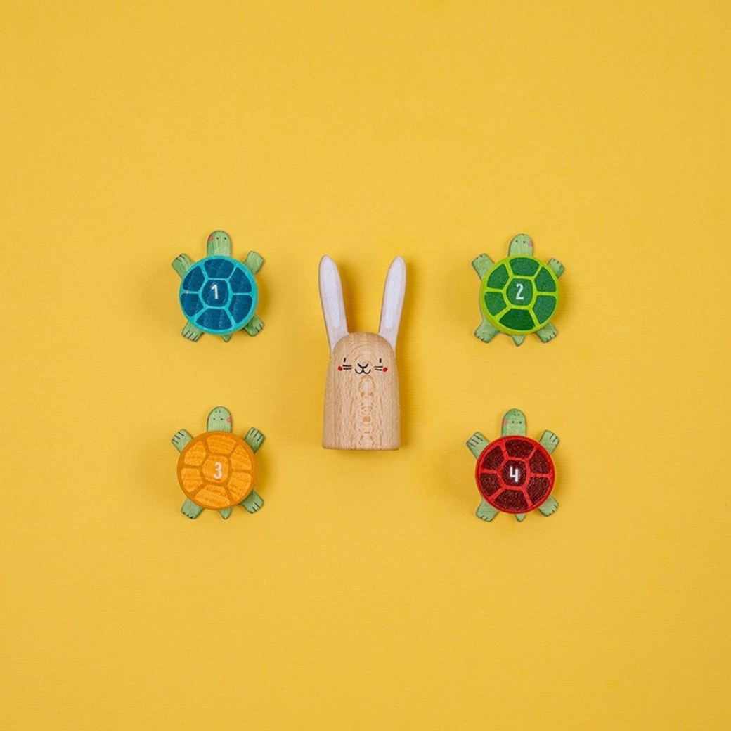 Et familiebrætspil inspireret af fabelen om skildpadden og haren byder på en spændende duel, hvor både hastighed og tålmodighed afgør udfaldet. Nyd de enkle regler, de smukke illustrationer og sjov for både børn og voksne i kapløbet mod målstregen.
