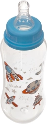 Praktisk og let Akuku børneflaske 250 ml med Space-motiv, ideel til daglig drik. Den har farvet låg, glade illustrationer og silicone-sut med medium gennemstrømning. Fremstillet af polypropylen uden BPA for sikker brug.