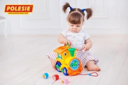 Toget er lavet af holdbar plastik, har glatte kanter og behagelige farver. Barnet kan nemt trække toget i snoren og indsætte formene de rigtige steder. Uret med visere støtter grundlæggende tidsforståelse gennem leg.