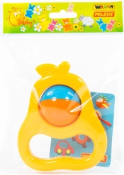 Farverig baby-rangle formet som en pære, lavet af kvalitets- og certificeret materiale til de allermindste. Takket være det ergonomiske greb ligger den godt i hånden og afgiver en behagelig lyd ved ryst, som støtter sanseudvikling og finmotorik. Let og sikker konstruktion, farve efter aktuel lagerstatus.
