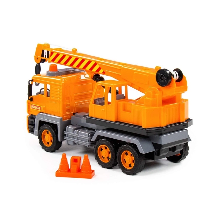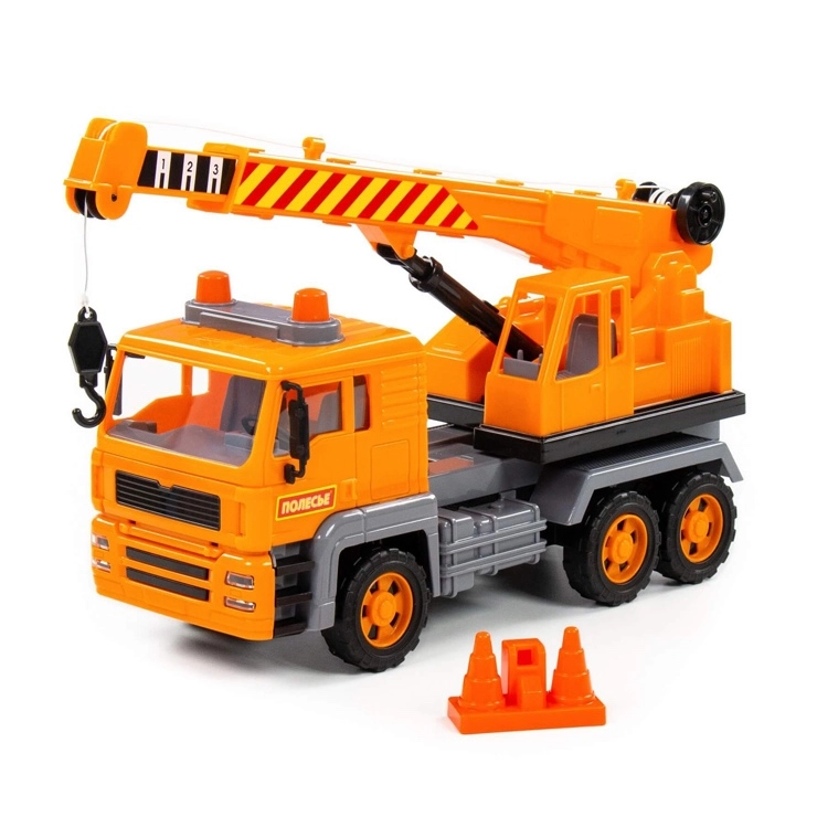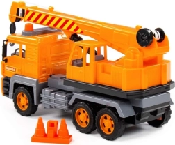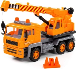 Realistisk legetøjskran med drejelig sokkel, udtrækkelig bom og krog styret af en manuel mekanisme. Lastbilen imponerer med detaljeret udførelse, imitation af forlygter, blinkende varsellys og friktionsmotor for jævn kørsel. Sættet inkluderer byggekegler for endnu sjovere leg.