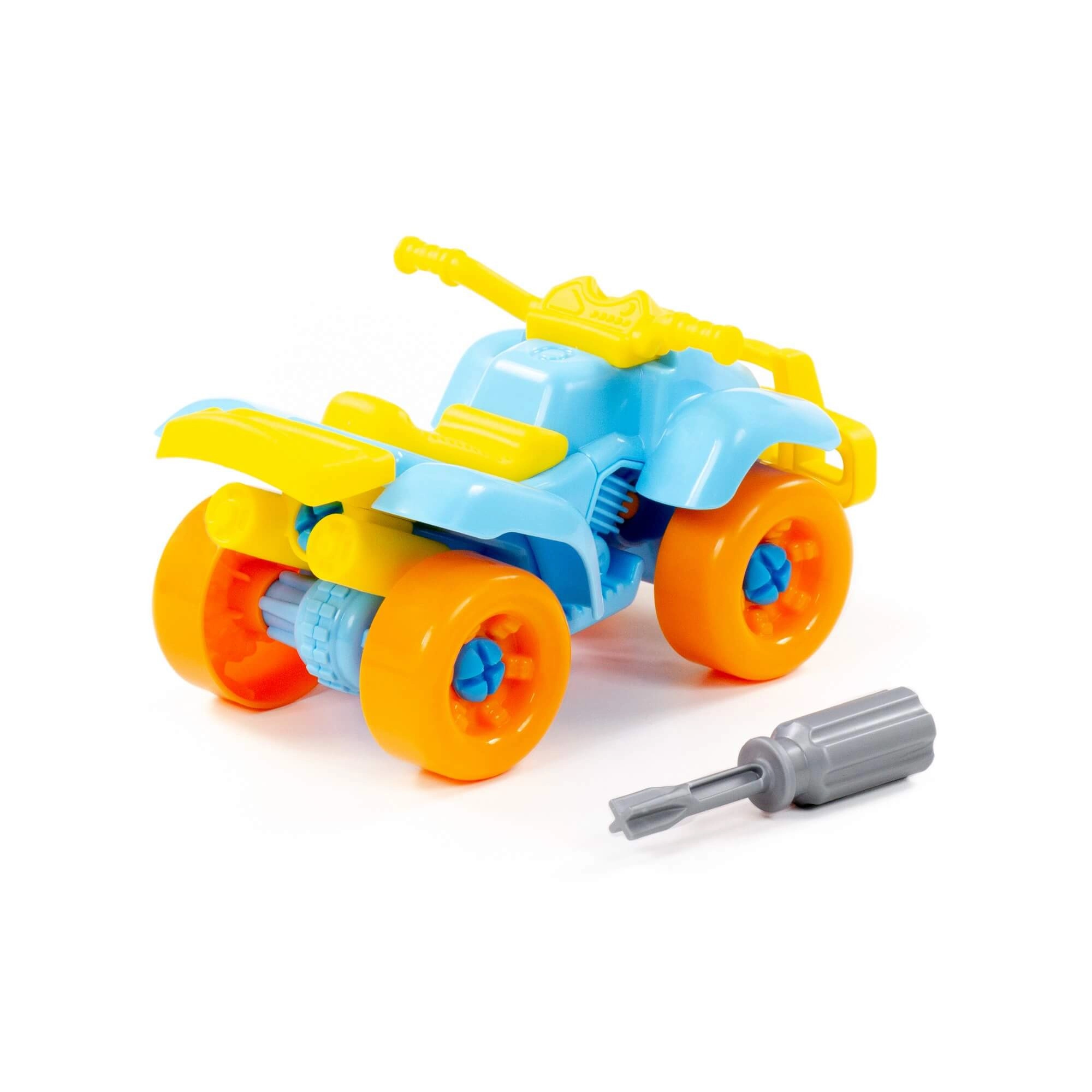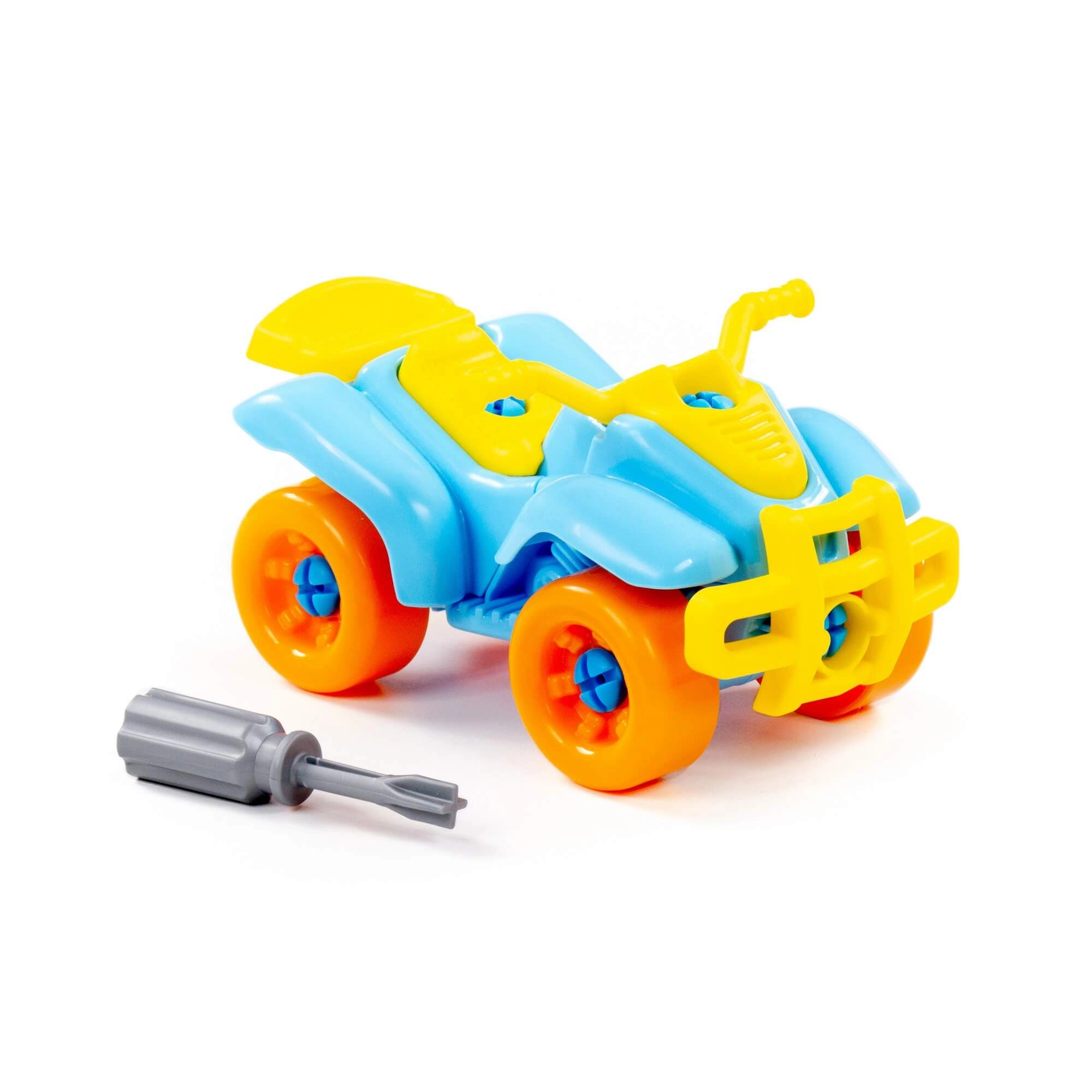 Der medfølger en børneskruetrækker. Børn træner nemt finmotorik og logik ved gentagen samling af firhjuleren.