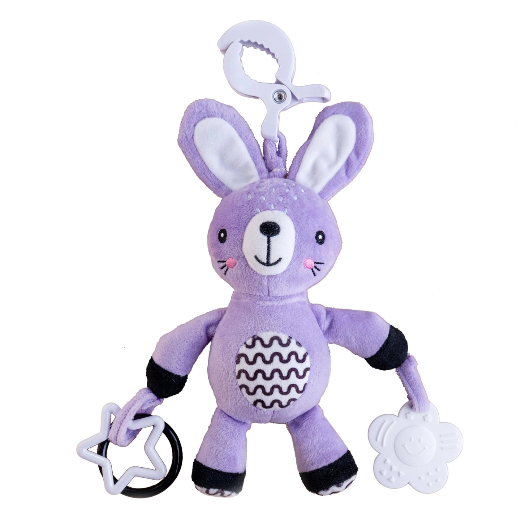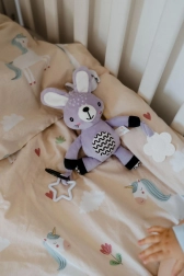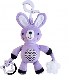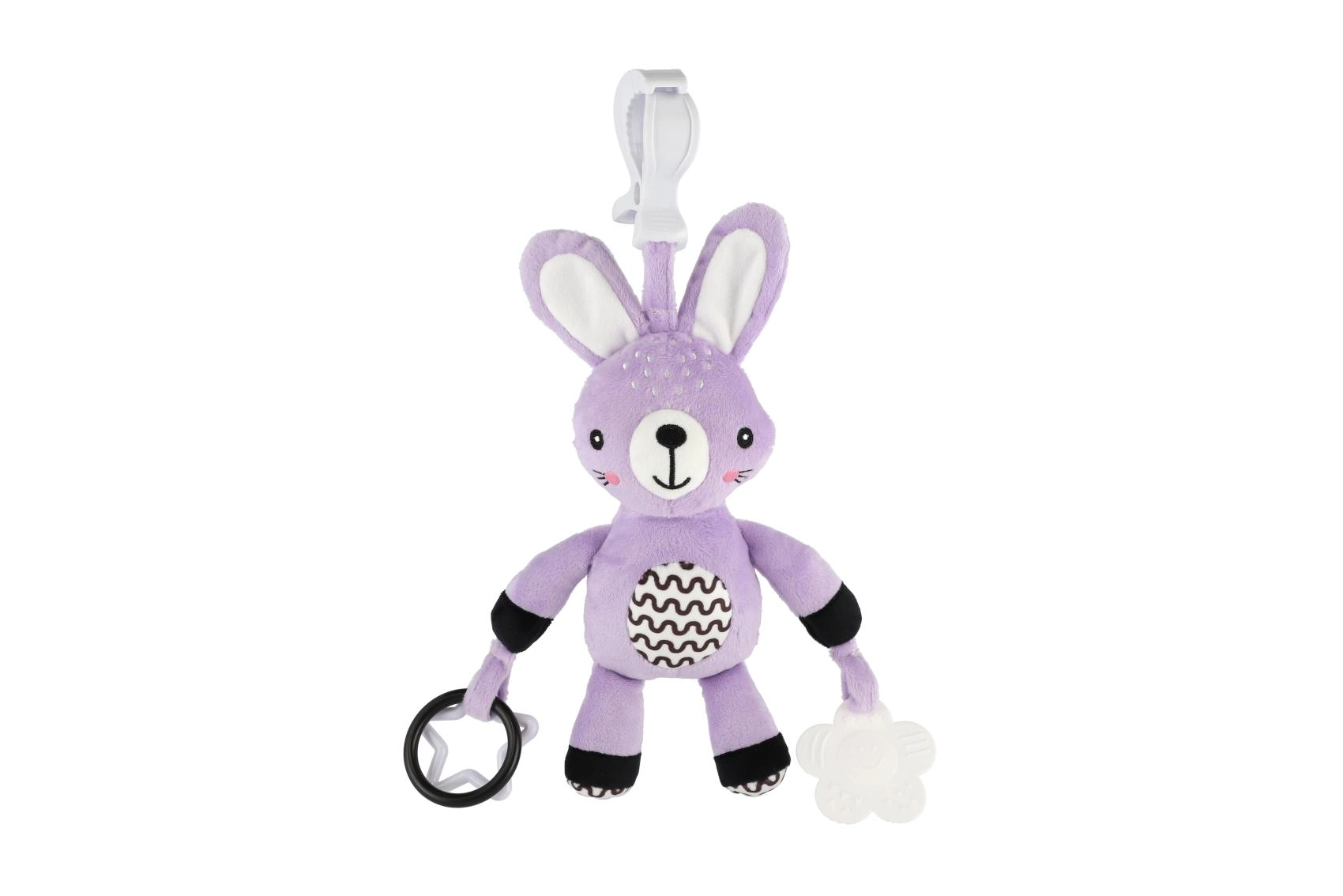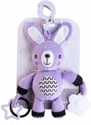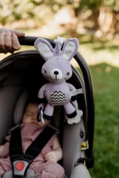 Sød plyskanin til spædbørn fra 0 måneder med praktisk klips til klapvogn, autostol eller tremmeseng. Tilbyder blid raslen, superblødt materiale og sikre bideringe til at støtte sanser og finmotorik. Certificeret i CZ garanterer sikkerhed for de allermindste.