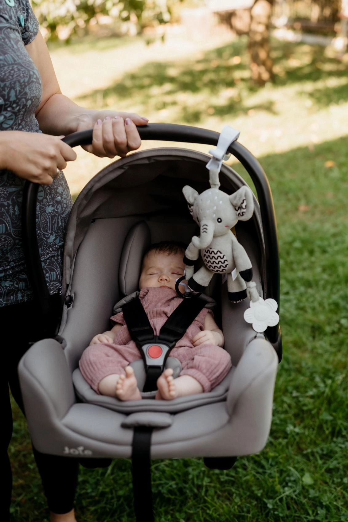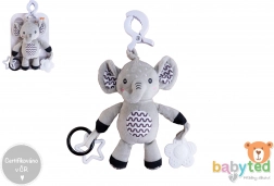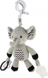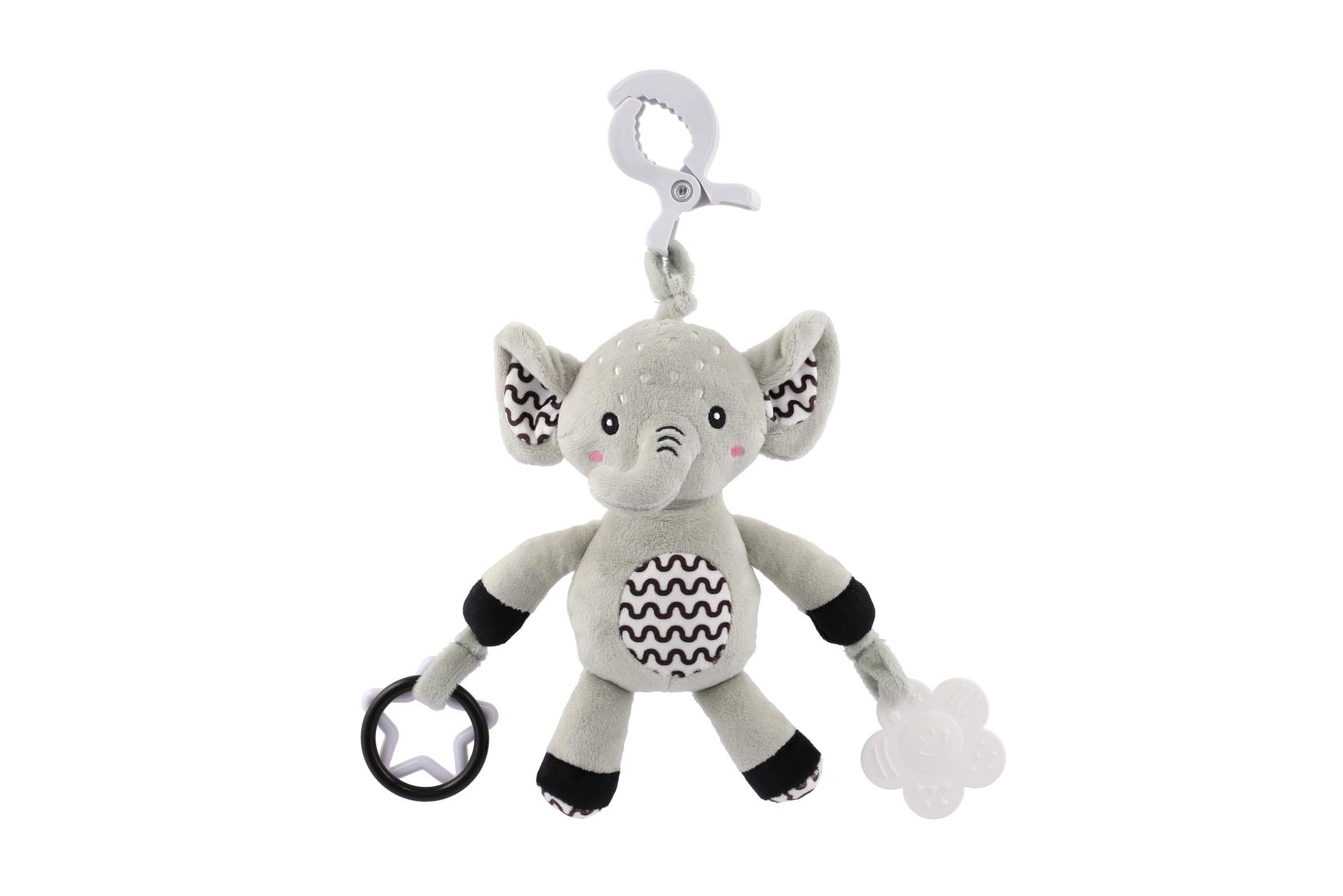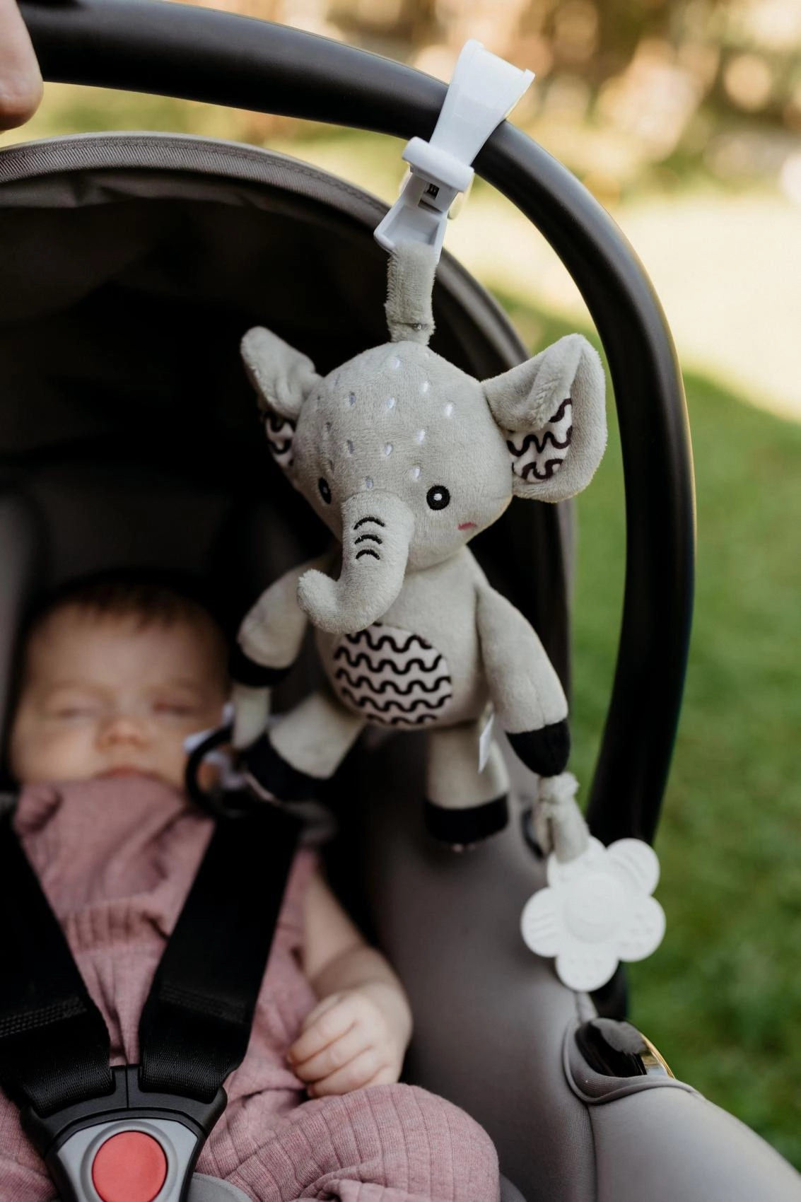 På et øjeblik fastgør du elefanten til barnevognen, sengen eller autostolens bøjle – ideel underholdning på ture og derhjemme.