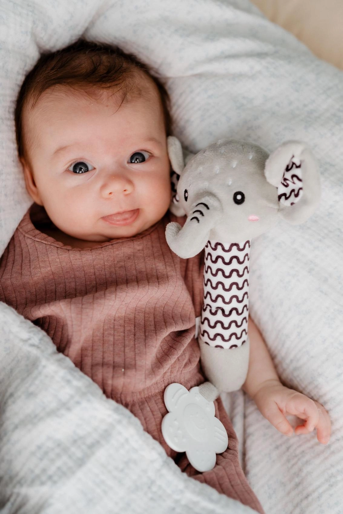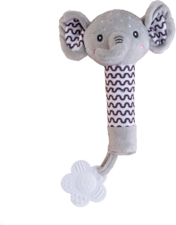 Ved tryk piver den lille elefant blidt, stimulerer høresansen og fanger barnets opmærksomhed uden for meget larm.