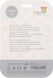 For enden af håndtaget er der en blød plastikbidering formet som en blomst, som hjælper med at lindre følsomme gummer under tandspring. Kontrastmønstre på ører og krop understøtter visuel perception og sanseudvikling. Legetøjet er certificeret i CZ og opfylder strenge sikkerhedsstandarder for børn 0m+.