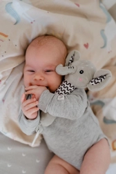 Plyselefanten med pivelyd og bidering er en ideel første legetøj til nyfødte. Takket være den ergonomiske, aflange form er den nem at holde selv i små hænder, den blide pivelyd stimulerer høresansen og fanger barnets opmærksomhed. Blødt, sikkert materiale giver en behagelig berøring og en beroligende følelse ved hygge.