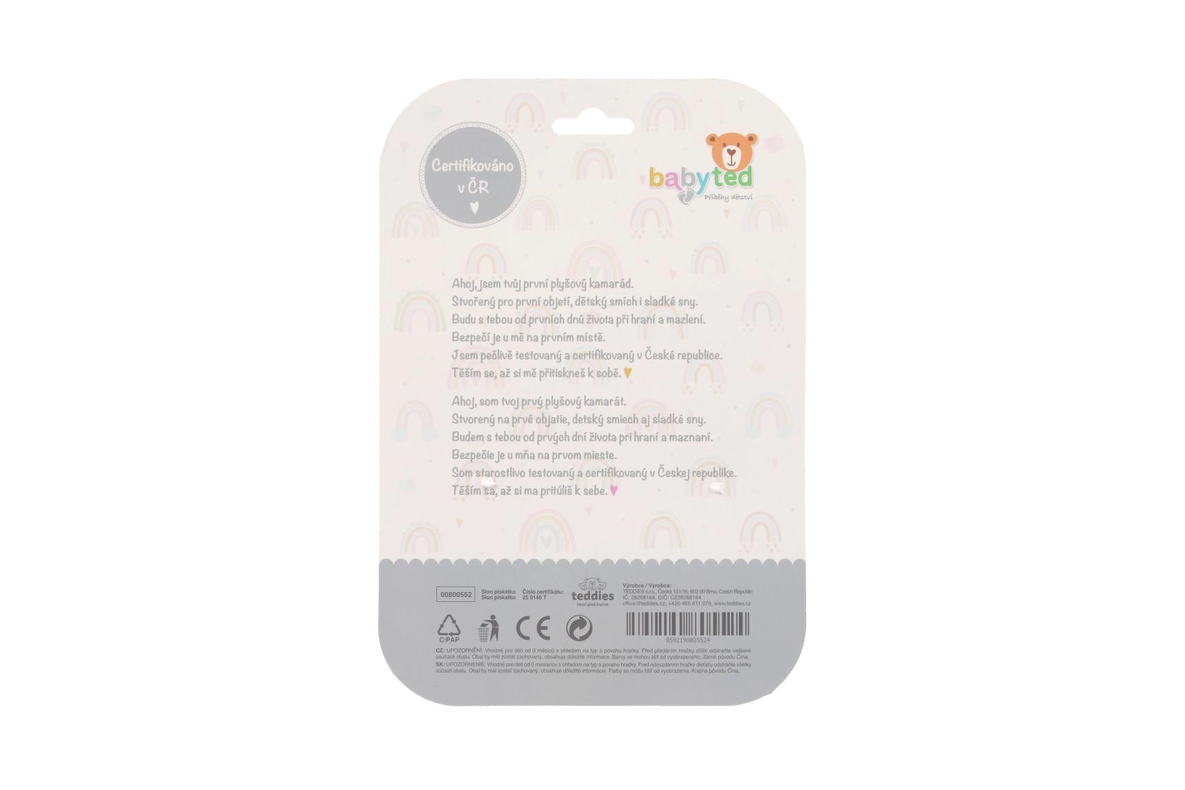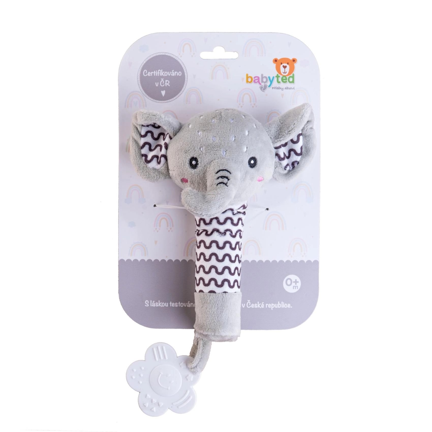 Den søde plyselefant med pivelyd og bidering fra BABYTED glæder spædbørn lige fra fødslen. Den har et blødt krop for nemt greb, piver blidt ved tryk, og for enden af håndtaget sidder en blød bidering formet som en blomst til lindring af følsomme gummer. Kontrastmønstre understøtter den visuelle perception, og sikker, blød plys er skånsom mod de mindste. Certificeret i CZ efter strenge sikkerhedsstandarder.