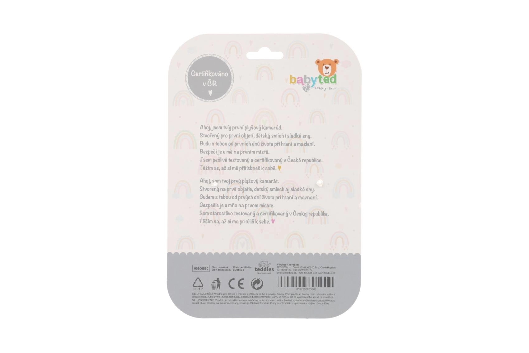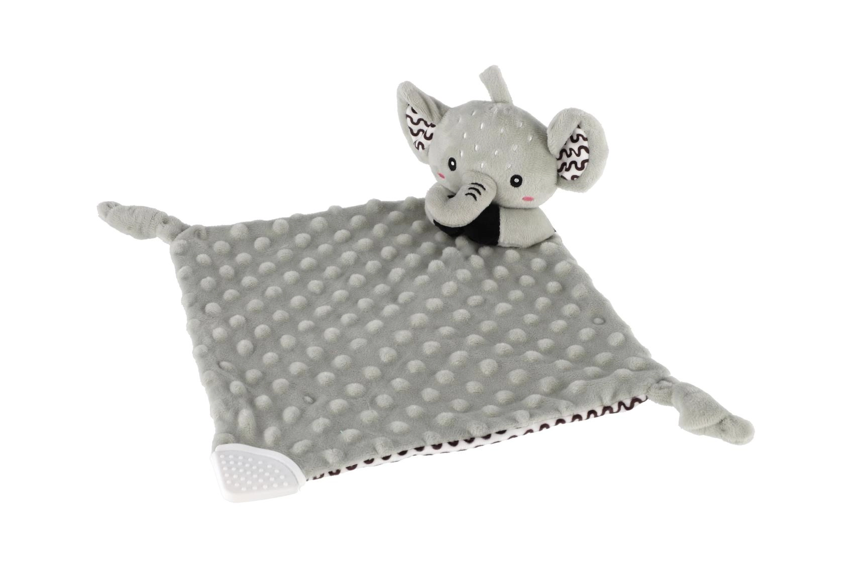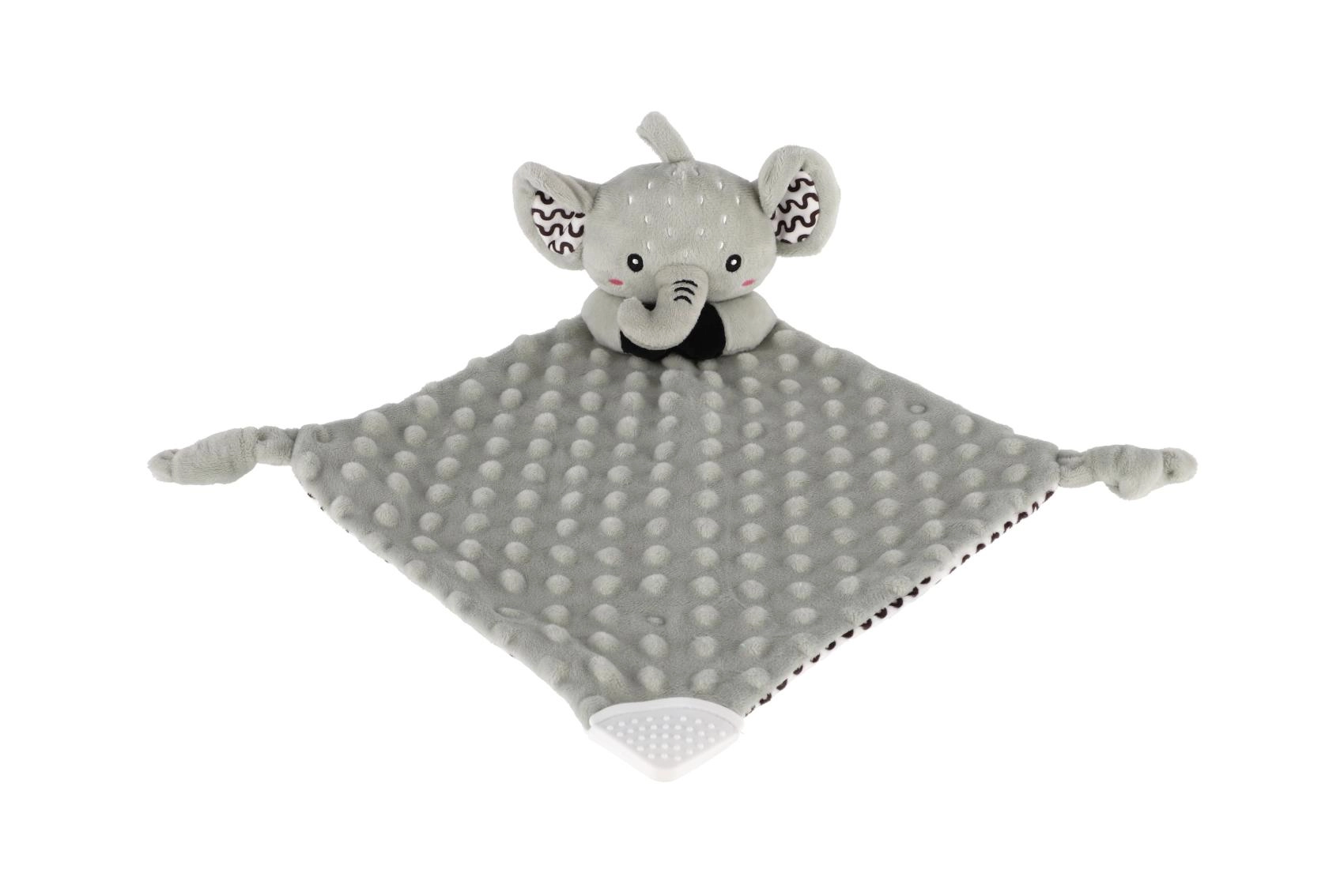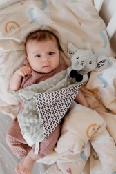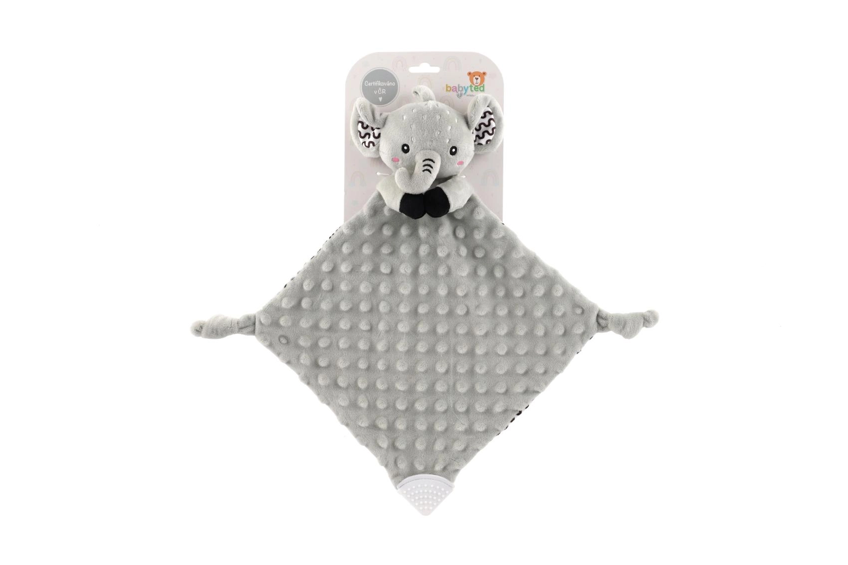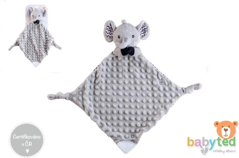 Den bløde nusseklud formet som en lille elefant fra BABYTED giver babyen en følelse af tryghed og en rolig søvn. Den superbløde minky med 3D-prikker indbyder til kram, den skjulte fine rangle stimulerer hørelsen, og den bløde silikone-bidering lindrer ved tandfrembrud. Velegnet fra fødslen, certificeret i Tjekkiet.
