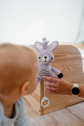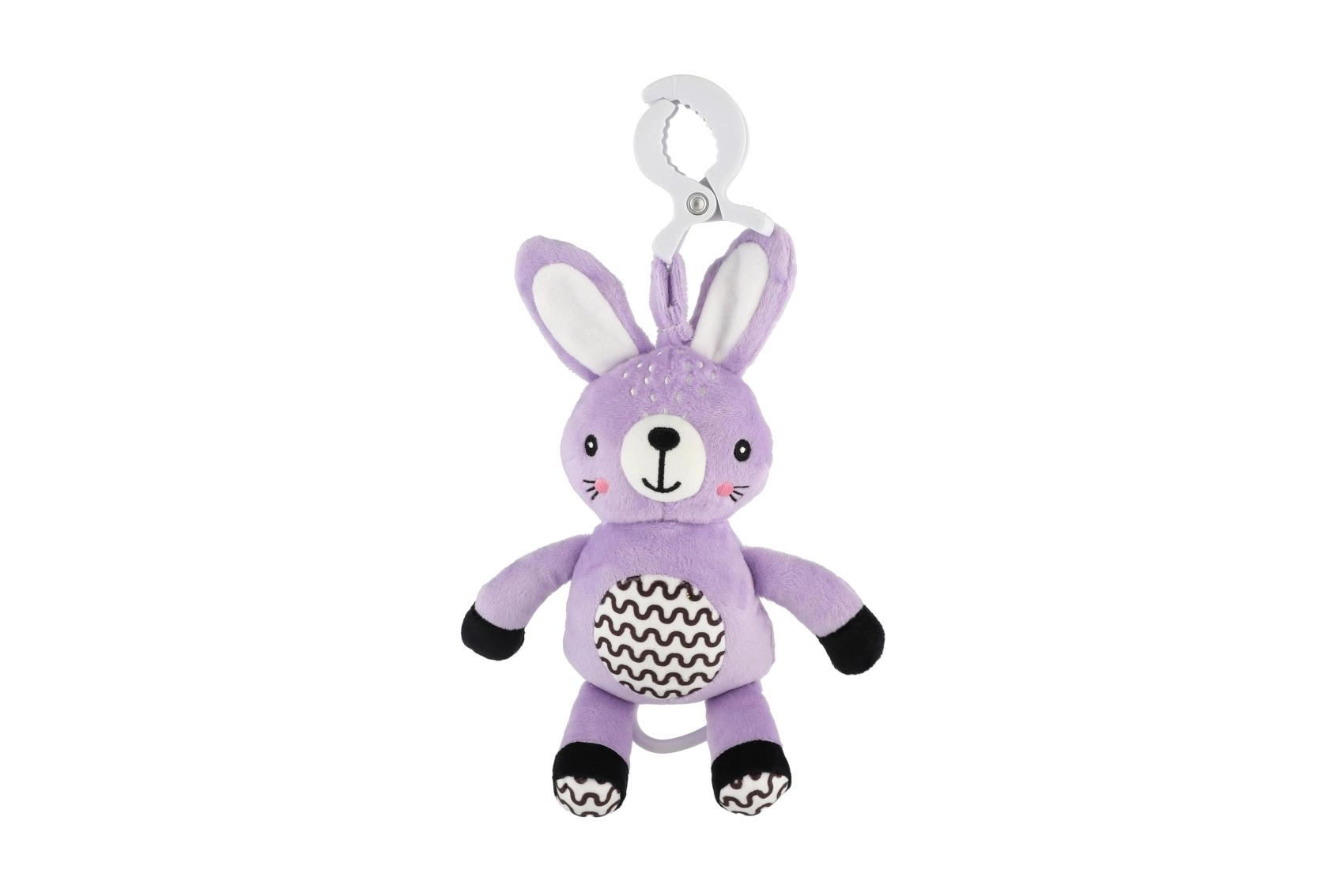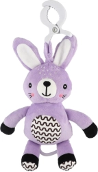 Denne hængende plyskanin giver babyen trøst, mild stimulering og sikker underholdning både hjemme og på tur. Træk-op mekanismen spiller en behagelig melodi, der skaber en rolig atmosfære til hvile. Takket være den universelle clip kan legetøjet nemt fastgøres på barnevogn, tremmeseng, autostol eller aktivitetsstativ.