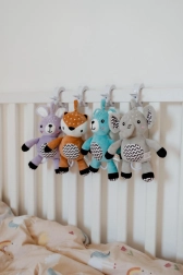 Den praktiske clip gør det hurtigt at fastgøre kaninen på barnevogn, tremmeseng, autostol eller aktivitetsstativ – altid lige ved hånden hjemme og på farten.