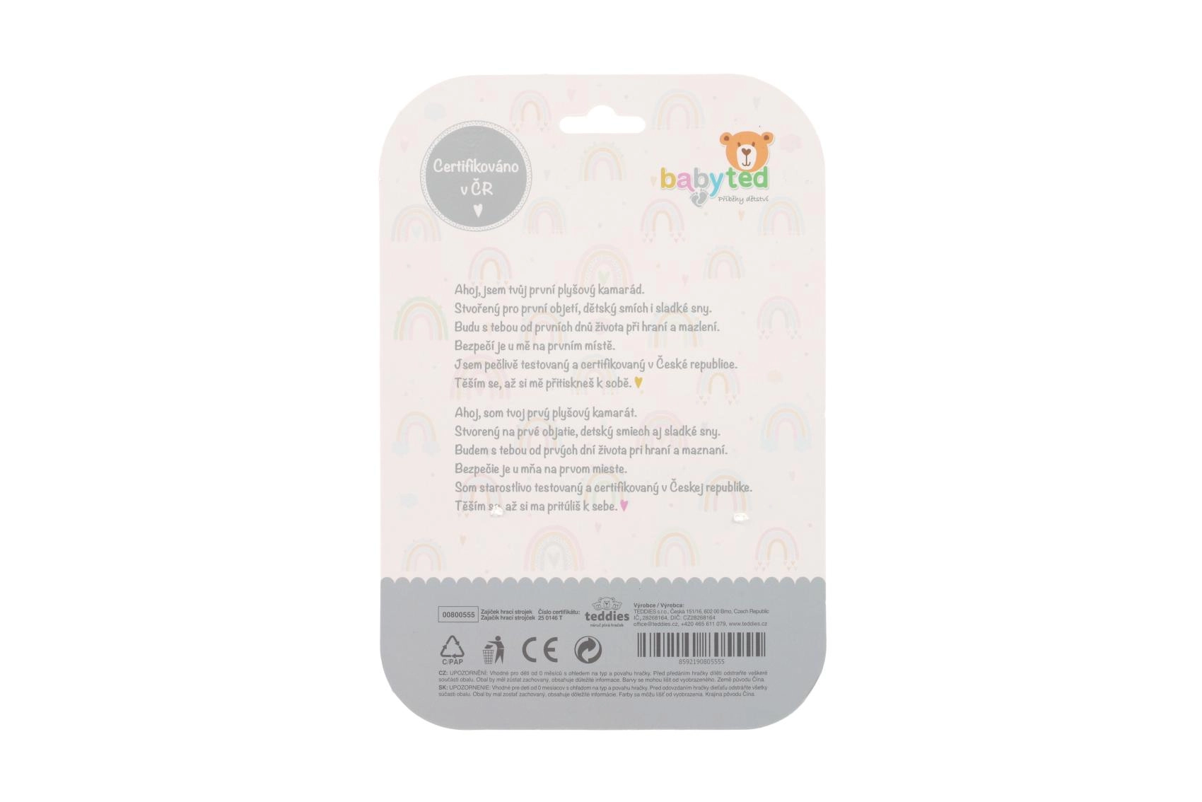 Den bløde plys indbyder til kram, mens kontrastdetaljer og de let knitrende ører understøtter udviklingen af syn og finmotorik. Kvalitetsforarbejdning og certificering i Tjekkiet garanterer sikker brug fra fødslen.