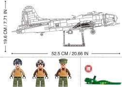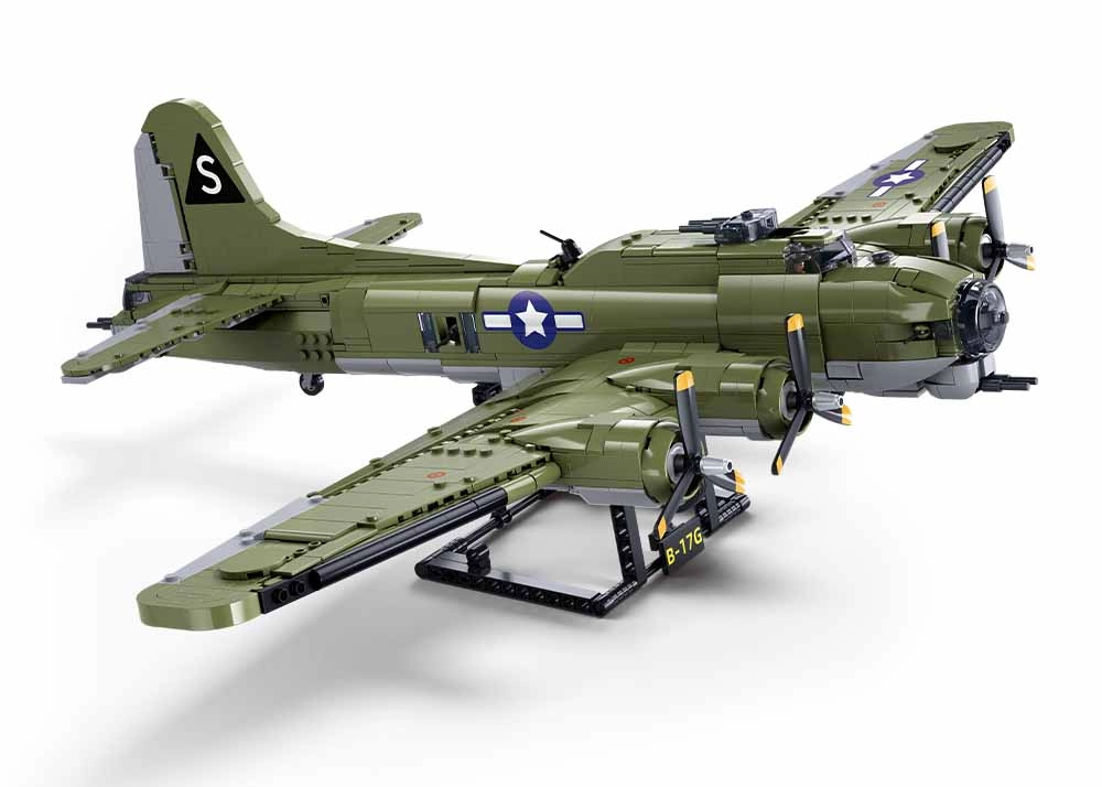 Modellen byder på en række funktionelle elementer: indtrækkeligt landingsstel, drejende propeller og bevægelige dele af vinger og sideror til konfiguration for flyvning eller landing. Medfølger stand med B-17G-betegnelse og 3 minifigurer af besætningsmedlemmer med tilbehør. Byggesættet er kompatibelt med LEGO, Cobi og Mega Bloks, så du nemt kan udvide din model med flere elementer.