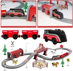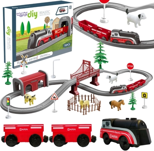Tag på en malerisk tur på gården med den elektriske togbane WOOPIE i et rigt sæt på 70 dele. Lokomotiv med elektrisk drift, magnetiske vogne samt tunnel og bro forvandler hver leg til et realistisk eventyr. Børn skaber deres egne scener med dyr, færdselsskilte og dekorationer, hvilket udvikler fantasi, logik og finmotorik.