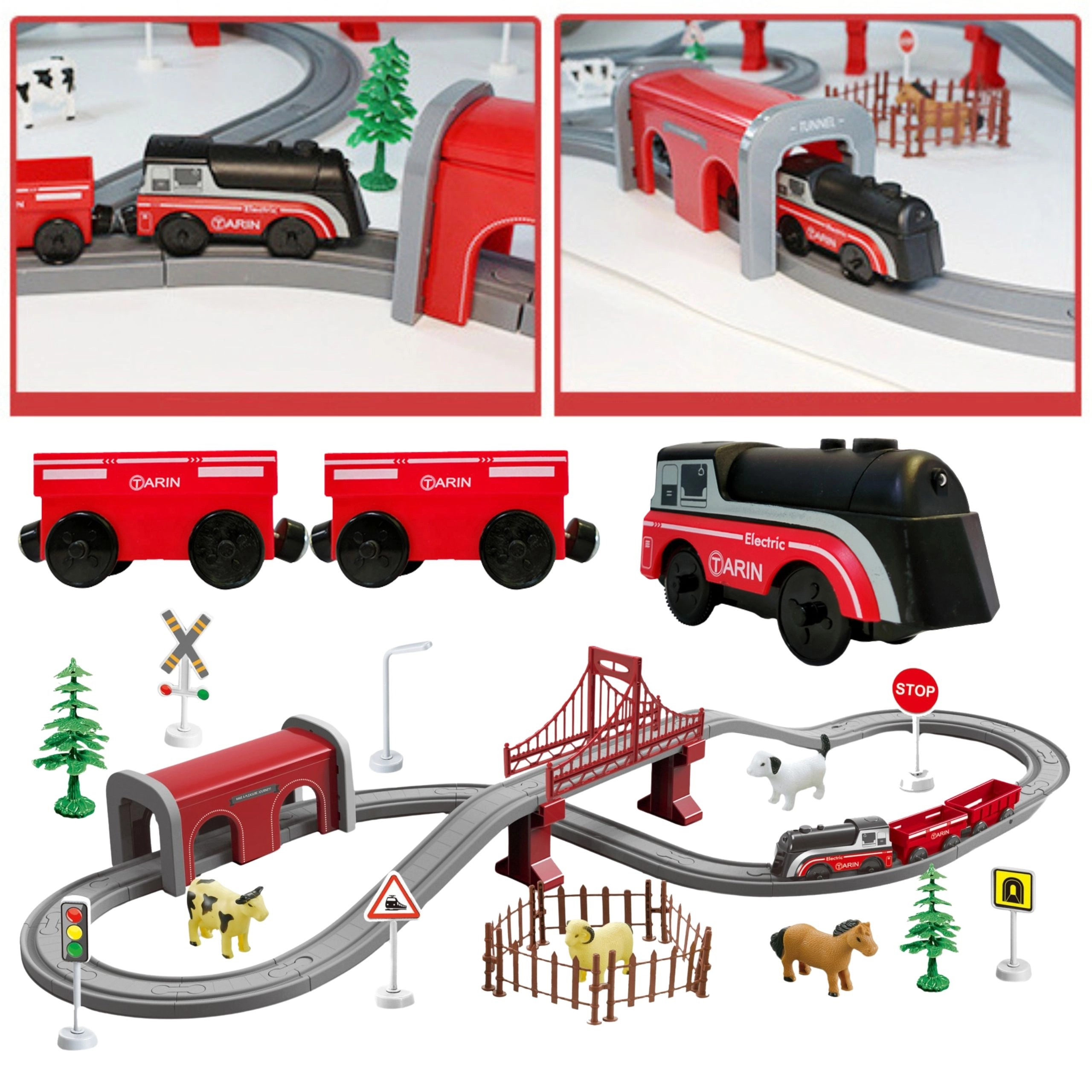 - Rigt tilbehør: bro, tunnel, skilte, træer, hegn og dyr til at skabe din egen verden.