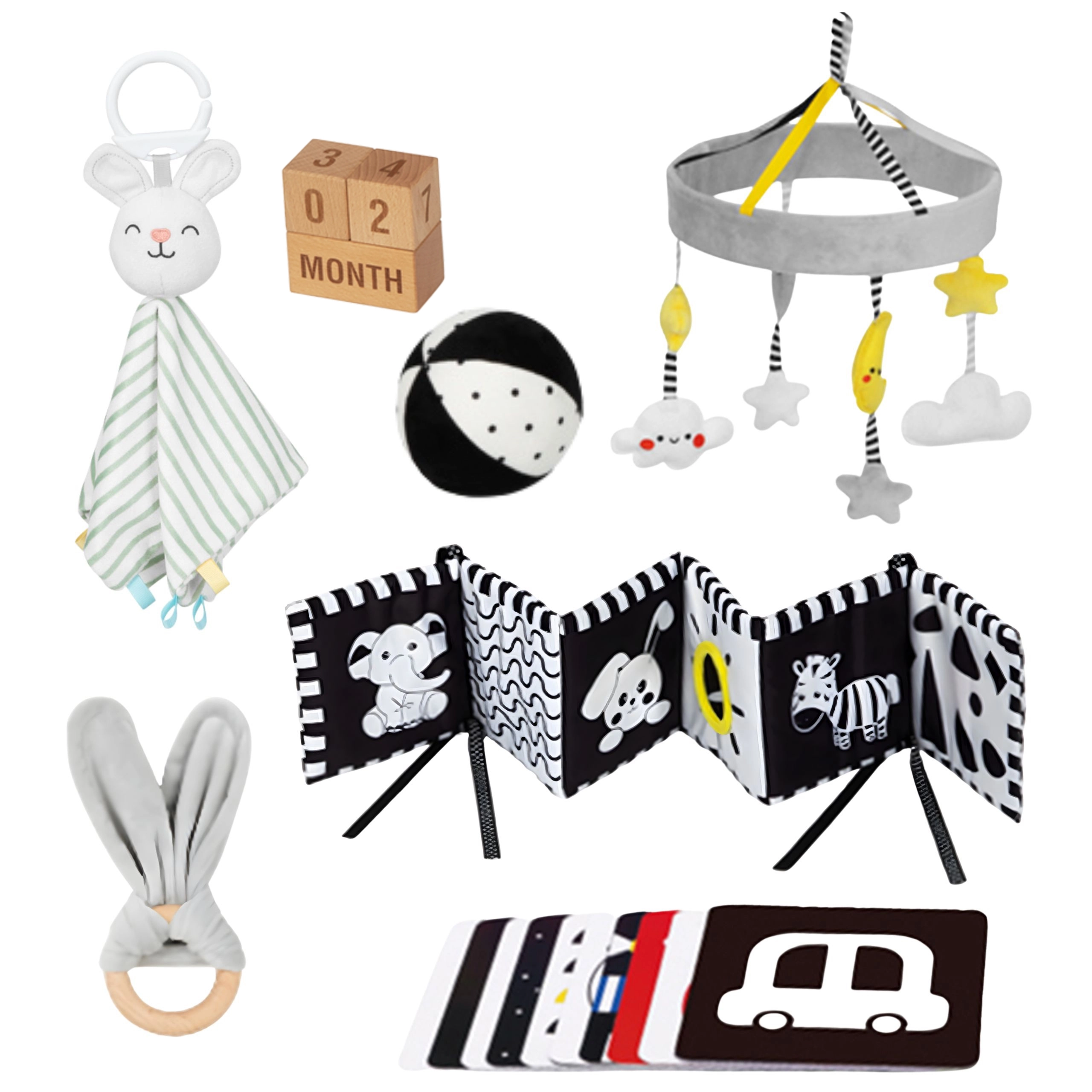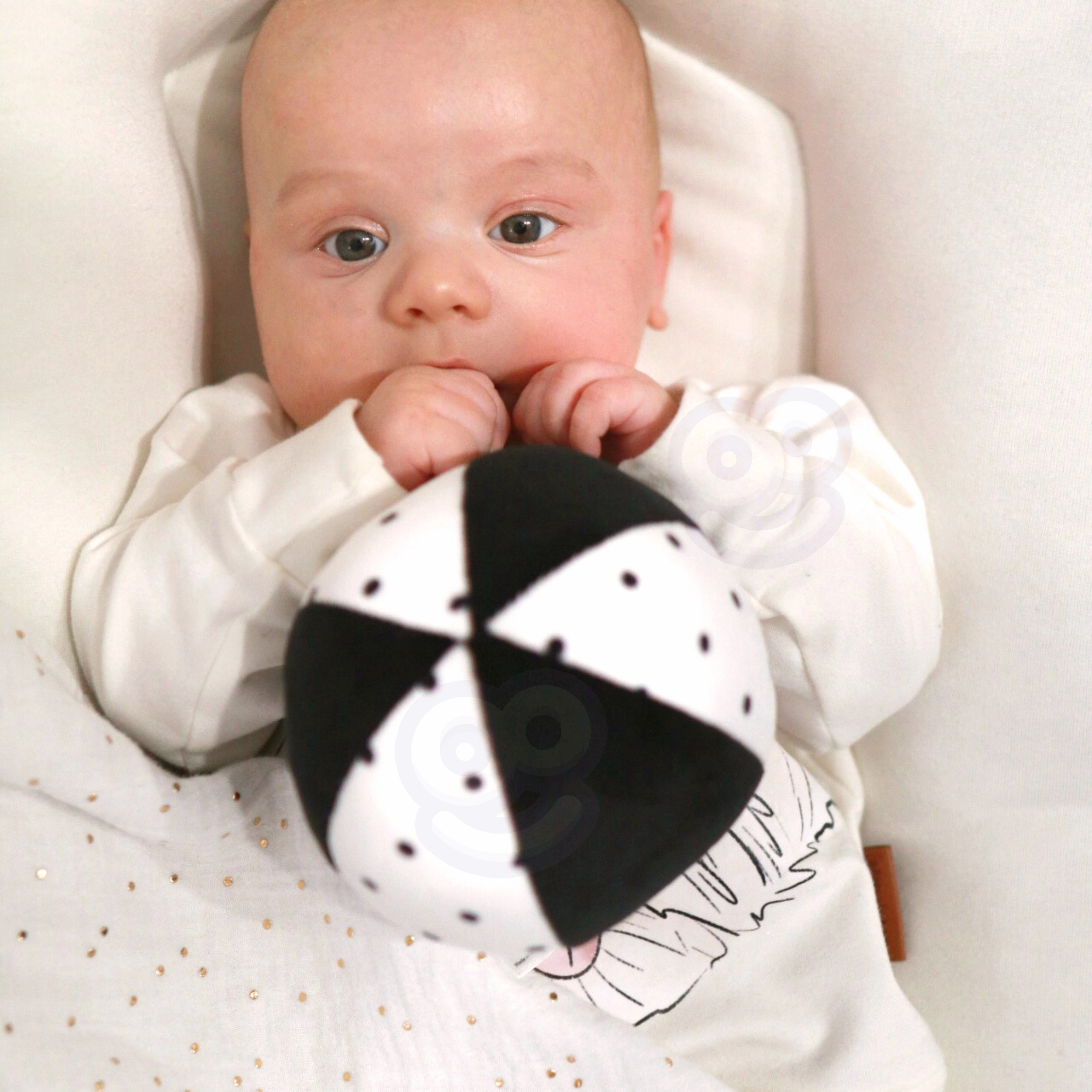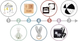 Dette gennemtænkte sæt tilbyder 6 didaktiske redskaber samt tilbehør til at forevige milepæle. De højkontrastede mønstre tiltrækker barnets opmærksomhed og understøtter visuel udvikling, mens de bløde teksturer indbyder til taktil udforskning. Let, sikkert og nemt at gribe – alt sammen fremmer finmotorik og de første fokuserede lege.