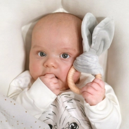 Træbideringen med tekstile “ører” er let at holde selv for de mindste hænder, hjælper under tandspring og støtter hånd-øje-koordination.