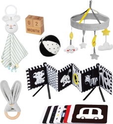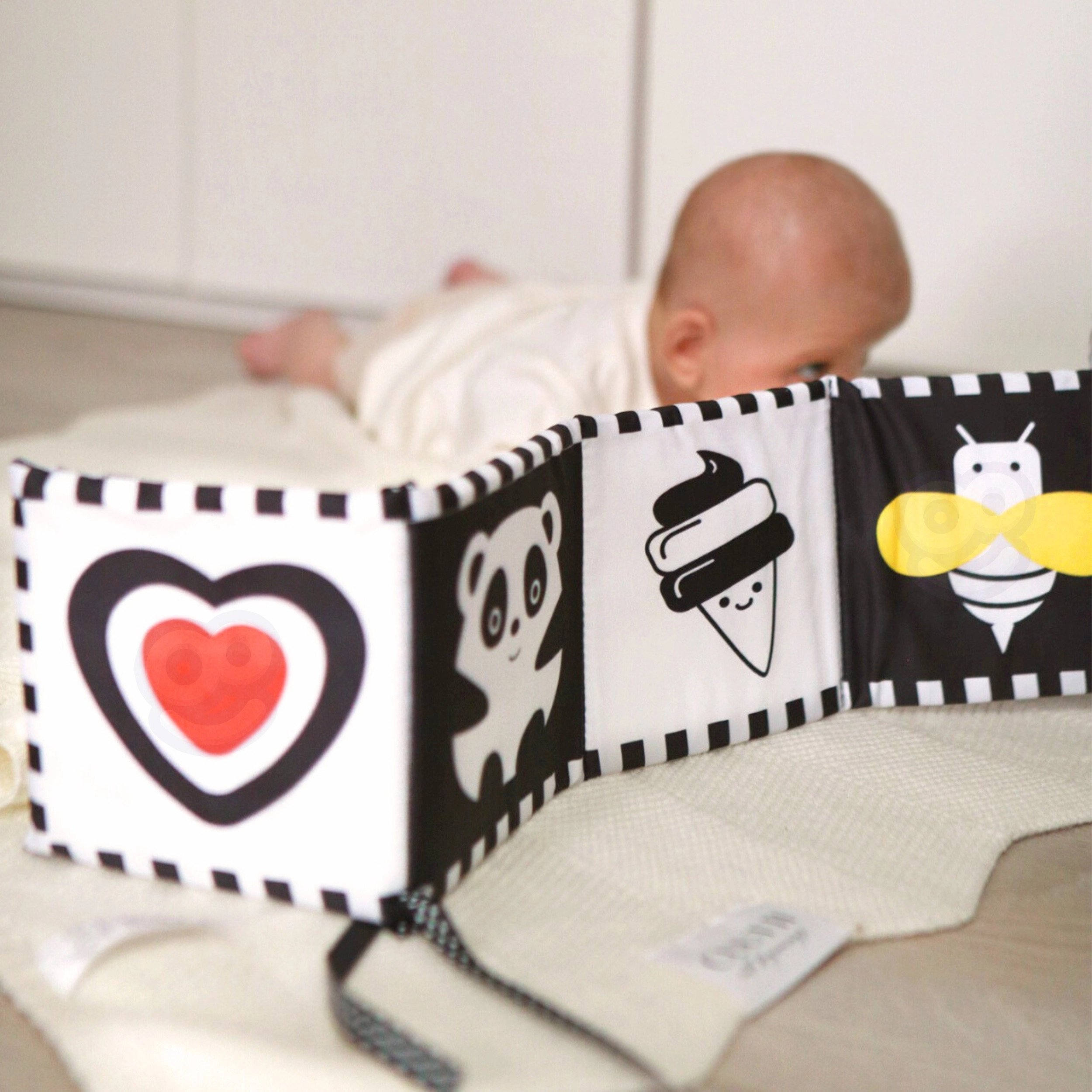 Sort-hvide mønstre på kort, bog og panel fanger naturligt nyfødtes blik, støtter den første fokusering og forlænger koncentrationstiden under tummy time.