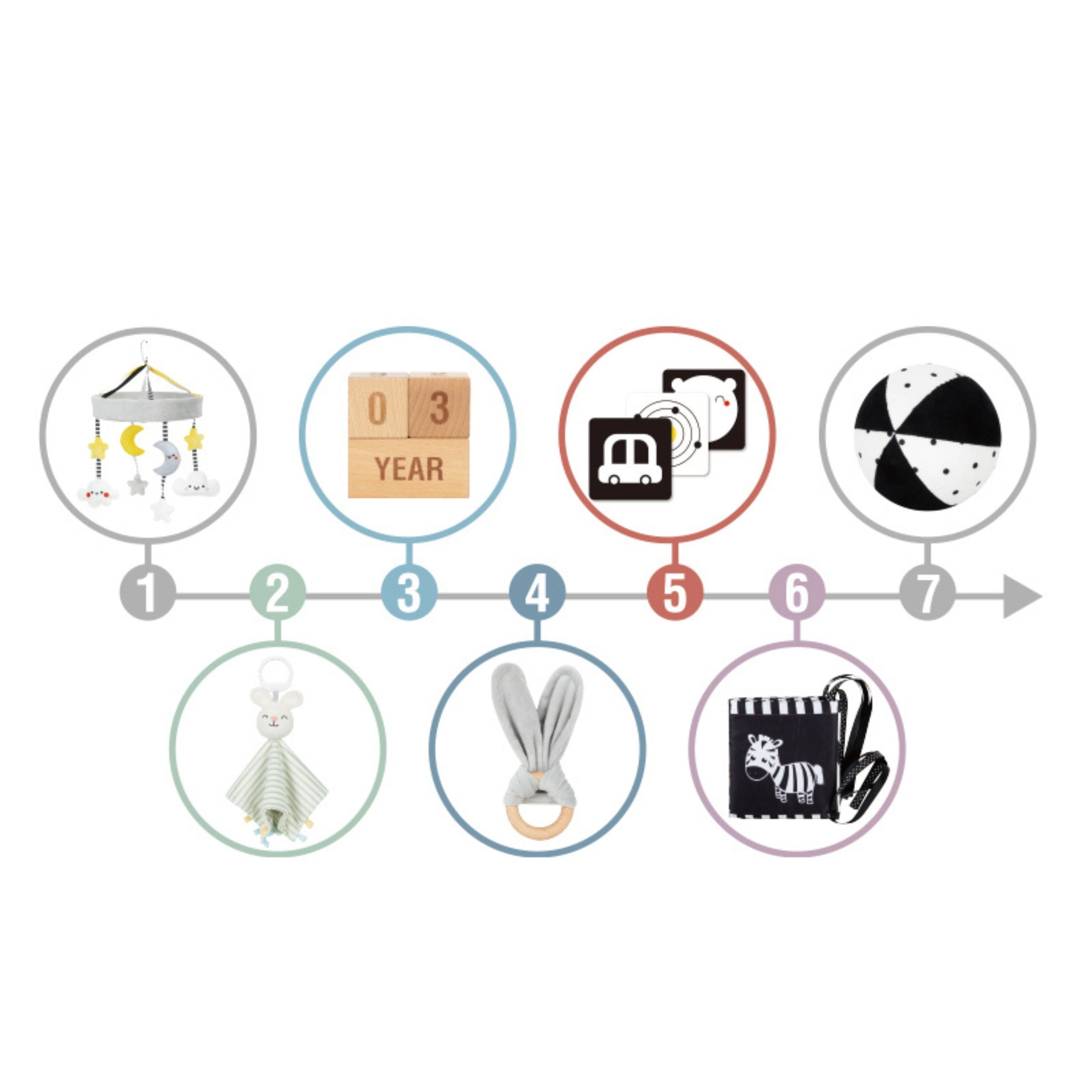 - 6 stykker legetøj + forældreguide + milepælsblokke