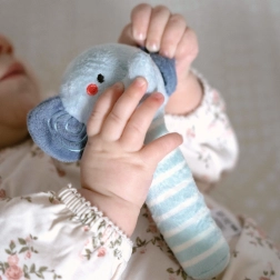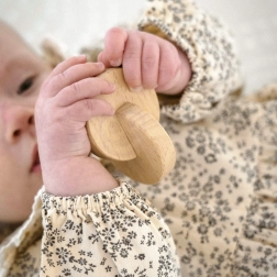 Ergonomisk formede træelementer og farverige rullende rangler udvikler greb, øje–hånd-koordination og forståelse for årsag–virkning ved at rulle og ryste.