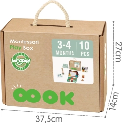 Denne omhyggeligt sammensatte montessori-boks bringer 6 didaktiske hjælpemidler, der understøtter babyens naturlige læringstempo. Kontrastmønstre og spejl stimulerer synet, bløde tekstiler og træ udvikler følesansen, og den blide raslen eller “regn” i røret opmuntrer hørelse. Alt er designet til at motivere barnet til at gribe, flytte, rulle og de første opdagelser af årsag og virkning.