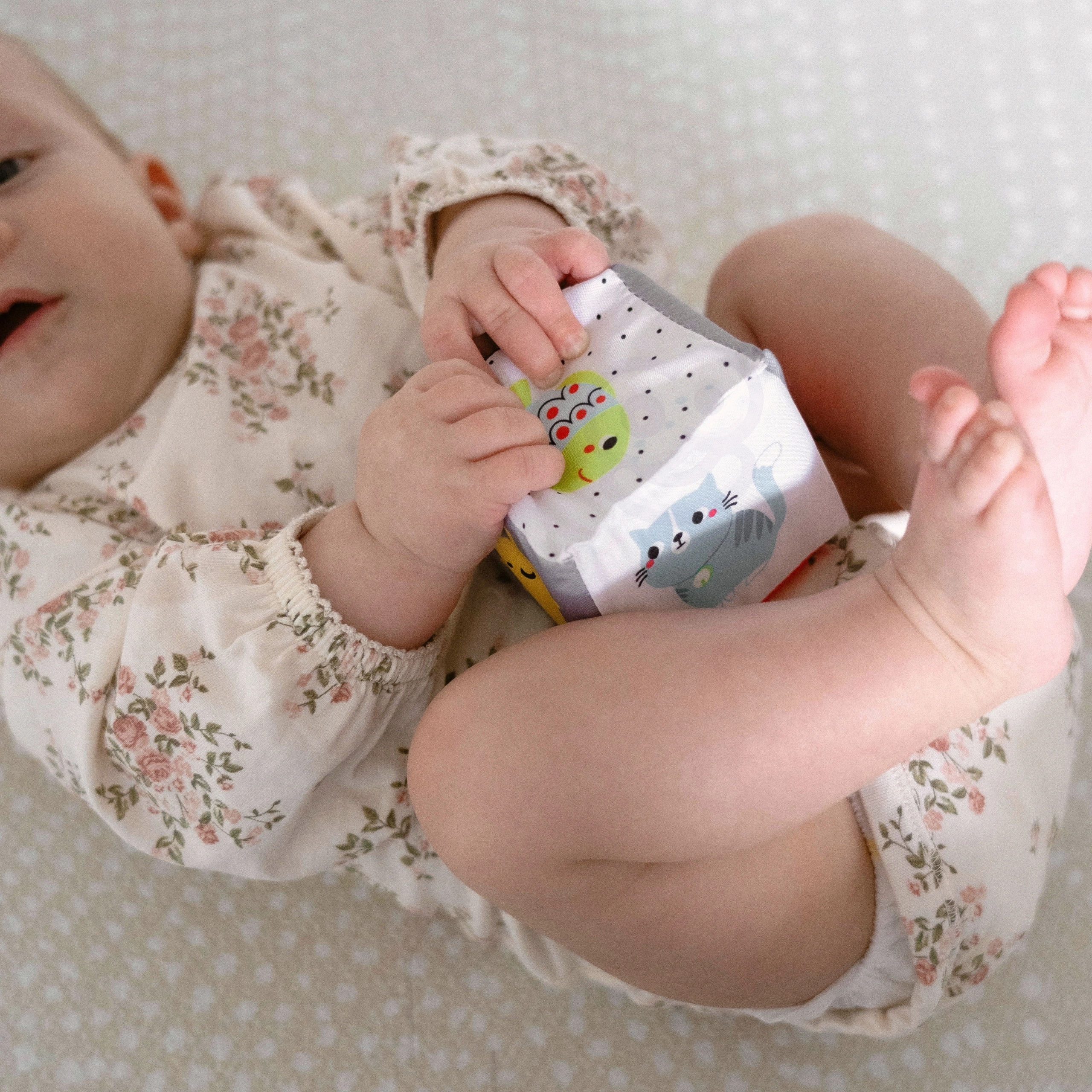 Indeholder: bløde aktivitetsklodser (4 stk.) med klokker, roterende trædisk til at gribe og rulle, højkontrast “mystisk spejl” til mave-tid, farverige trærangler/rolly, regnrør med kugler og en blød rangle–bidering formet som et dyr. Sættet er ideelt som gave til nybagte forældre – det tilbyder rig senso-motorisk stimulering og rolig, fokuseret leg.