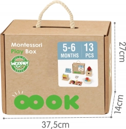 Omfattende Montessori boks 6-i-1 til babyer fra 5–6 måneder, som støtter psykomotorisk udvikling, sansemæssig opfattelse og hånd-øje-koordination. Indeholder 5 sanse- og didaktiske legetøj inklusive en blød stofbog, magisk æske med stofklude, bidering, sensoriske bolde og en roterende tromme, plus en detaljeret forældreguide. En fantastisk gave til baby.