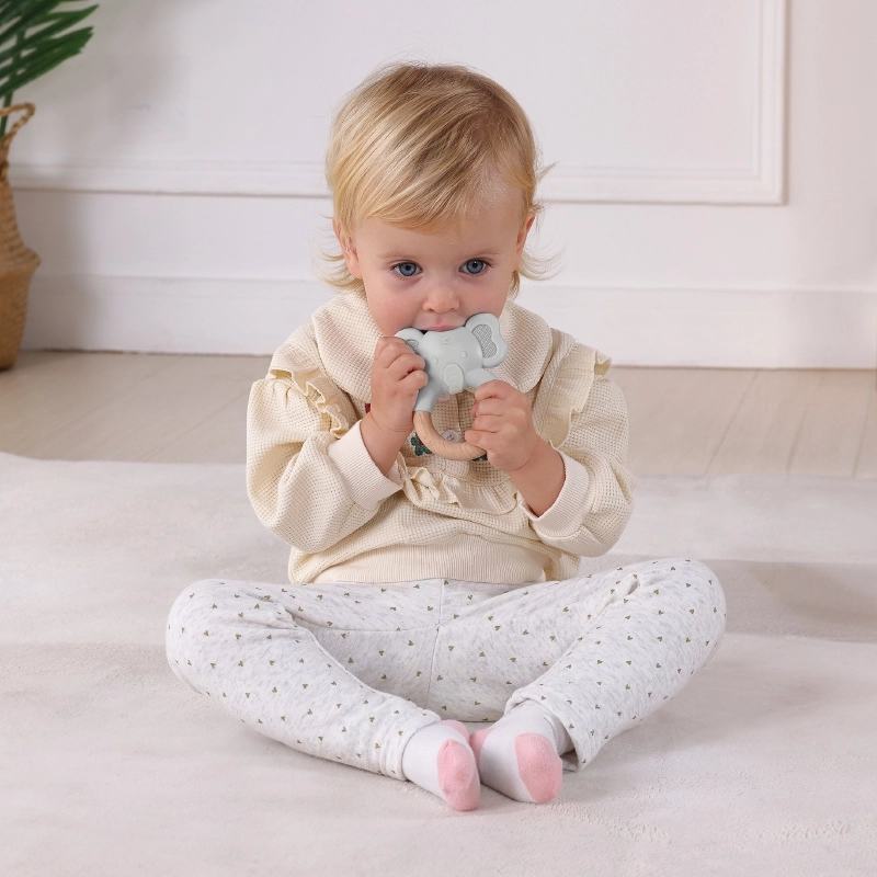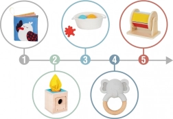 Alle elementer er designet til små hænder: en blød stofbog til den første bladren, magiske bokse med klude til endeløs opdagelse, en sikker silikone-bidering som lindrer ved tandfrembrud, sensoriske bolde med forskellige teksturer til taktile indtryk og en roterende tromme med farver og spejl for visuel fascination.