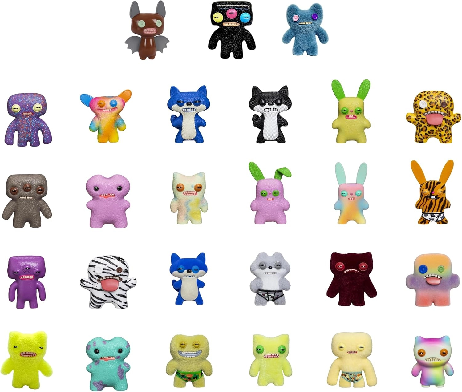 FUGGLER-sættet bringer to tilfældige figurer, hver med sit eget udtryk, farver og teksturer. Fra blottede små tænder og knapøjne til pelsede eller plastiske overflader – disse bizarre “ugly-cute” karakterer er skabt til at underholde og skille sig ud på hylden eller skrivebordet.