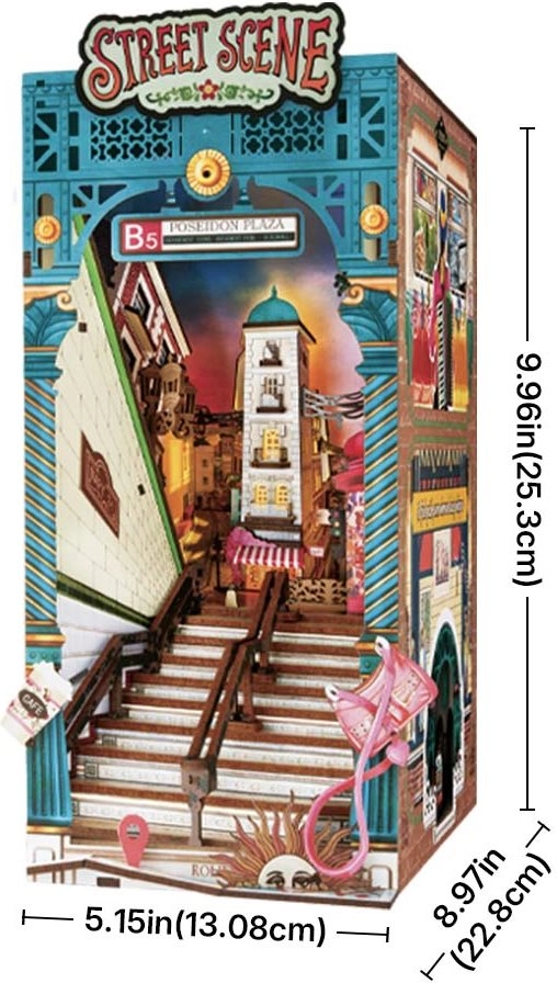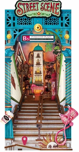 Dette DIY-sæt fra ROLIFE Book Nook-serien forvandler din bogreol til en malerisk bygade. Den øverste del af scenen giver udsigt fra gadeniveau – med lamper, skilte, belægning og lysende vinduer. Ved trappen finder du små rekvisitter fra bylivet, som en papirkop kaffe og en lyserød håndtaske, og for rejseelskere også motiv af sol og kortnål. Når den skubbes ind på hylden, overrasker et smart element: under trappen skjuler der sig en mini-station, som afsløres, når den trækkes ud.