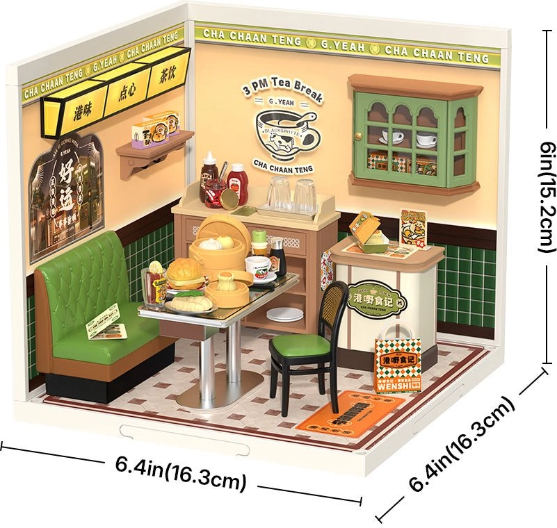 Oplev charmen ved en traditionel hongkongsk café i miniature med modellen Rolife DIY dukkehus: hongkongsk café. Sættet med 114 dele og LED-belysning tilbyder nem samling (sværhedsgrad 1/5) på cirka 1 time og byder på autentiske detaljer som en grøn lædersofa, en serveringsvogn og ikoniske lækkerier inklusive dimsum, ananasboller og mælkete.