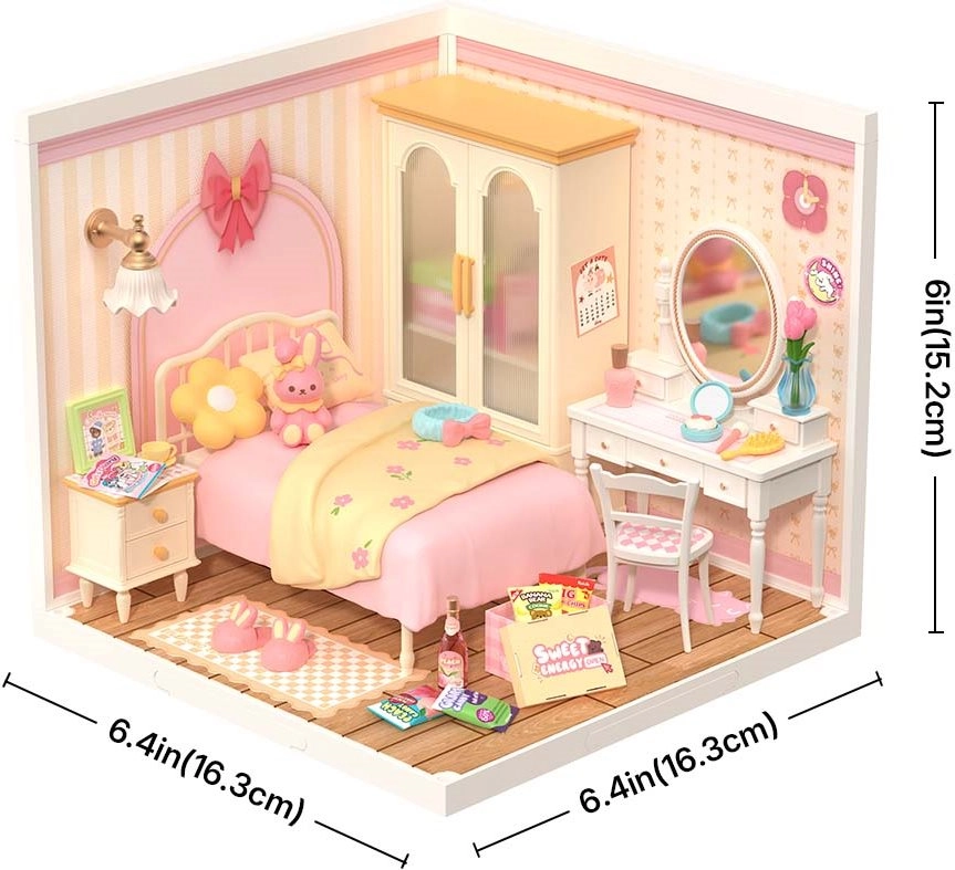 Dette smukke mini-soveværelse i pastelfarver tilbyder alt, hvad miniature-entusiaster sætter pris på: seng med tekstiler, toiletbord med spejl, natbord, indbygget garderobe og masser af små accessories. Den varme LED-belysning skaber en behagelig atmosfære og understreger den detaljerede udførelse af møbler og dekorationer.
