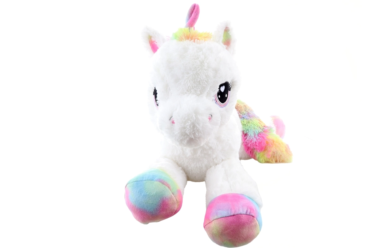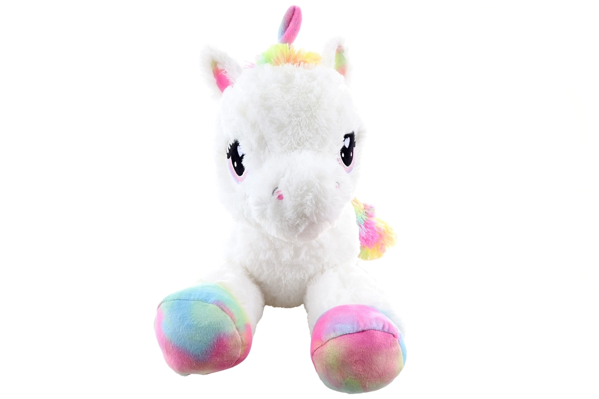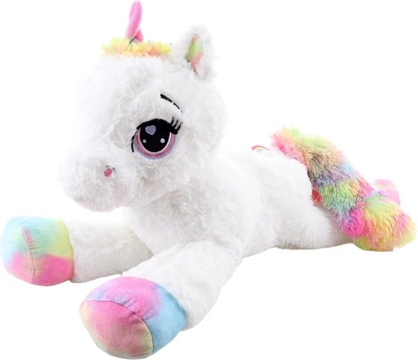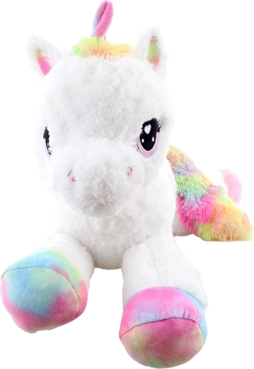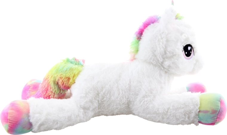 Den søde plysenhjørning på 80 cm vil glæde både børn og voksne. Den er ekstra blød, behagelig at røre ved og ideel til kælen. Farverige regnbuedetaljer giver legetøjet et magisk udseende, store broderede øjne og den fine udførelse sikrer sikker brug fra 0+ .