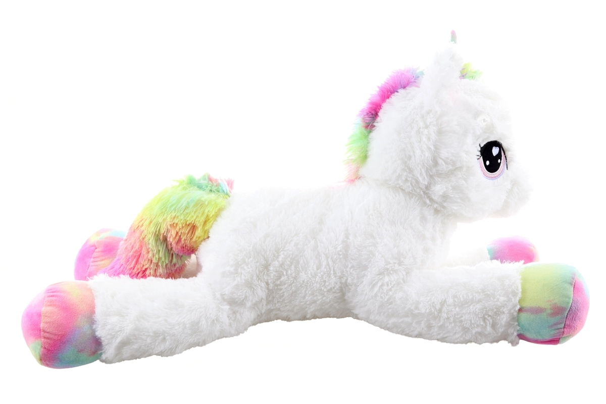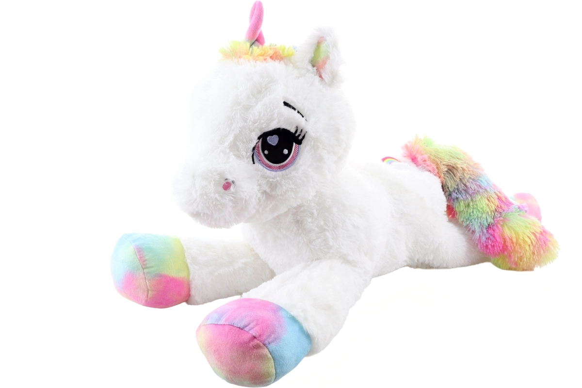 Denne hvide plysenhjørning med regnbuefarvede hove, man og hale bliver en trofast ledsager til både leg og afslapning. Den er lavet af ekstra blød plys, der indbyder til kram, og den liggende position passer perfekt på sengen og i børneværelset.