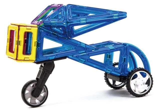 Det supplerende motorcykelhjul til MAGFORMERS udvider udvalget af hjul til at skabe originale modeller. Delen er designet til hurtig og nem klikmontering i MAGFORMERS-kvadratet, så børn straks kan bygge nye varianter af enkeltsporede køretøjer og trehjulede.