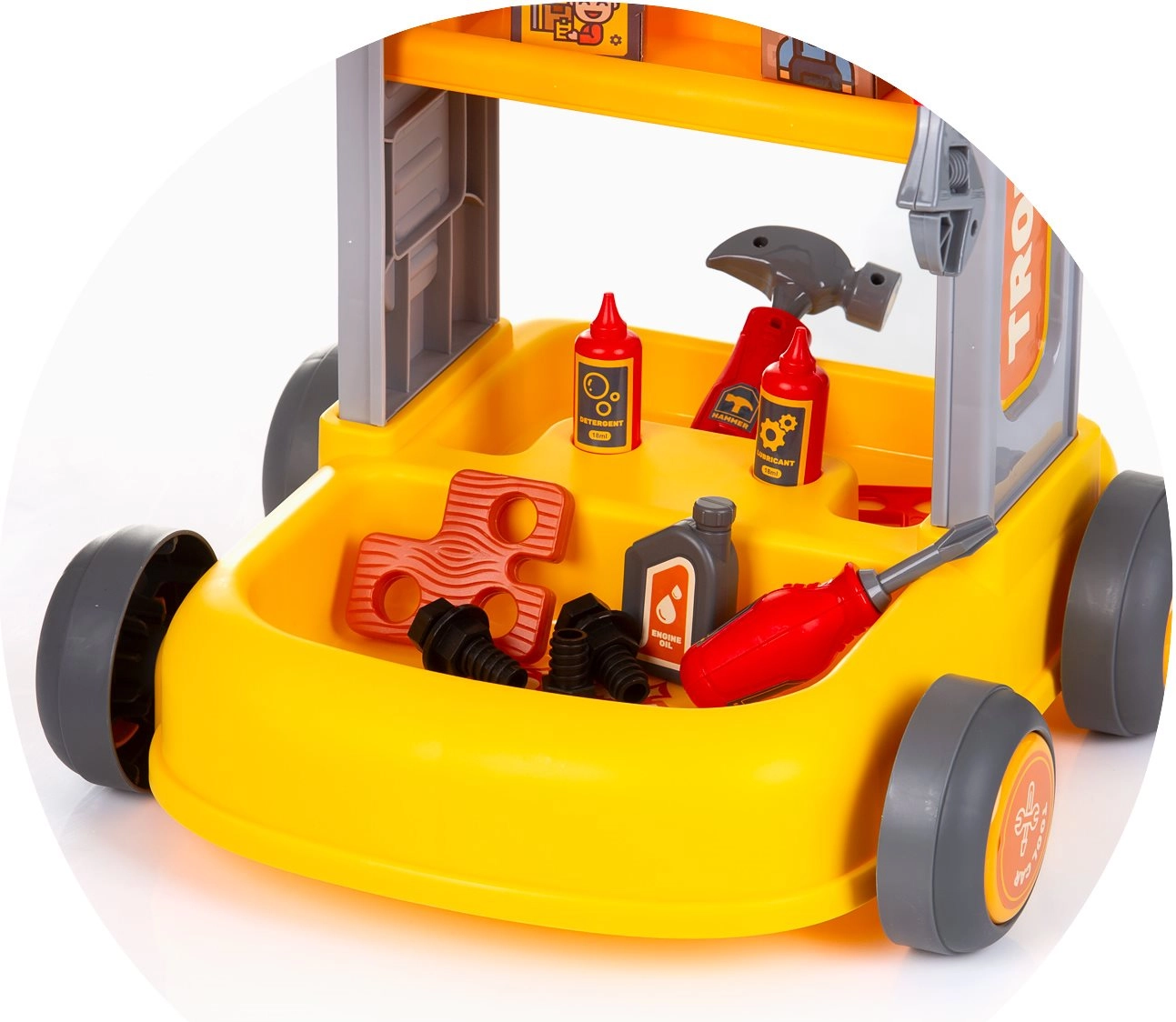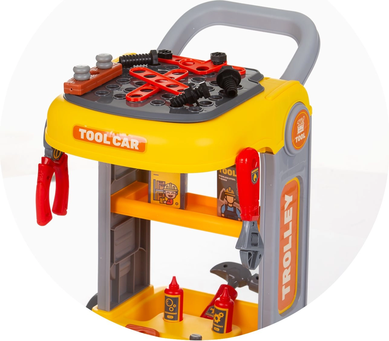 Nemt at flytte takket være det solide håndtag og hjulene. Børn kan tage deres værksted med overalt og have værktøjet lige ved hånden.